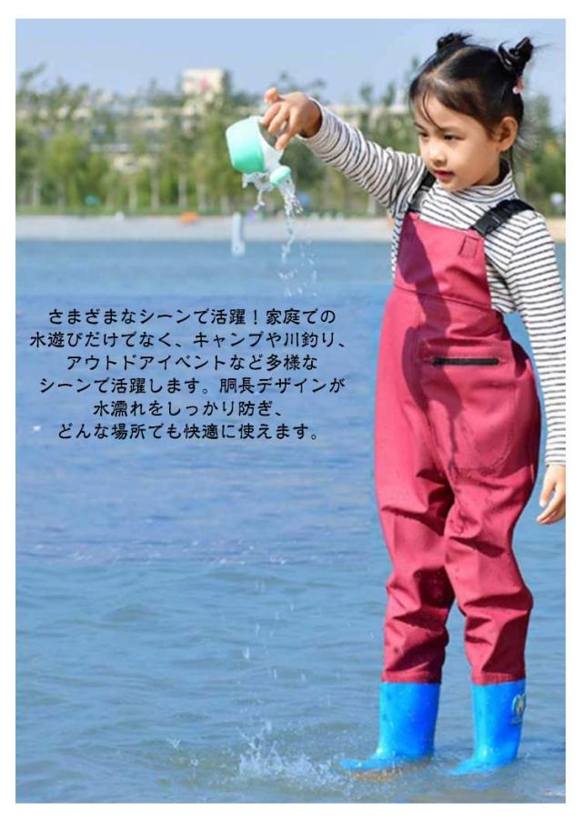 | 子供用ウェーダー。【ポケット付き】【13.0cm−22.0cm】 子供用ウェーダーは、防水性に優れた胴付き長靴仕様で、水辺の遊びや雨の日のアウトドア活動に最適。チェストハイウェーダーのデザインにより、水濡れを心配せずに存分に楽しめます。砂場遊びや川遊びでも安心です。 靴底には耐摩耗性の高い厚めのソールを採用し、滑りにくく安定感抜群。水中の硬い石やぬかるみでも安心して遊べる設計です。丈夫な素材で、長期間お使いいただけます。 ウェーダーにはPVC素材を使用し、柔らかく快適な着心地を実現。長時間の使用でも疲れにくく、子供が自由に動き回ることができます。さらに、防水加工で汚れも簡単に拭き取れます。 前面にはファスナー付きのポケットを搭載。おもちゃや小物を収納できるため、遊びの際に非常に便利。アウトドアでも必要な物をすぐに取り出せます。 さまざまなシーンで活躍!家庭での水遊びだけでなく、キャンプや川釣り、アウトドアイベントなど多様なシーンで活躍します。胴長デザインが水濡れをしっかり防ぎ、どんな場所でも快適に使えます。 | |
