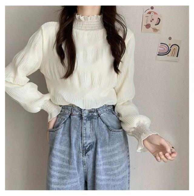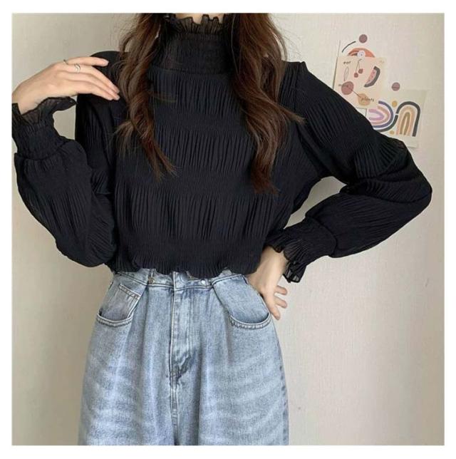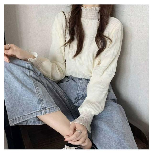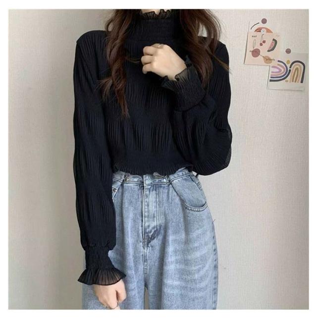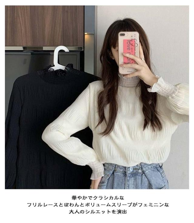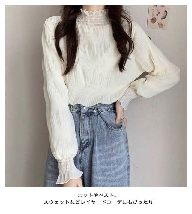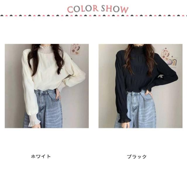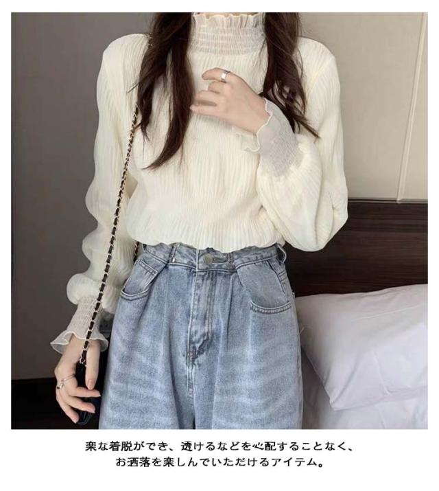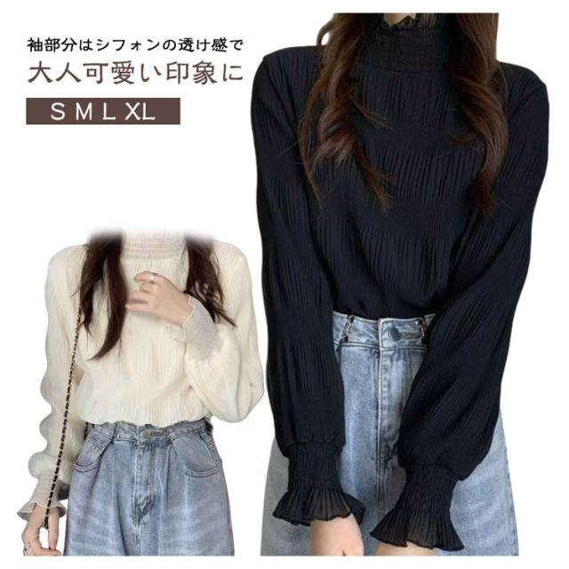 タートル ブラウス シアーシャツ タートル トップス ハイネック ギャザー シャーリング フリル シフォン レディース 長袖インナー タートルネック フロントギャザー 白 ホワイト ブラック シンプル フェミニン 大人