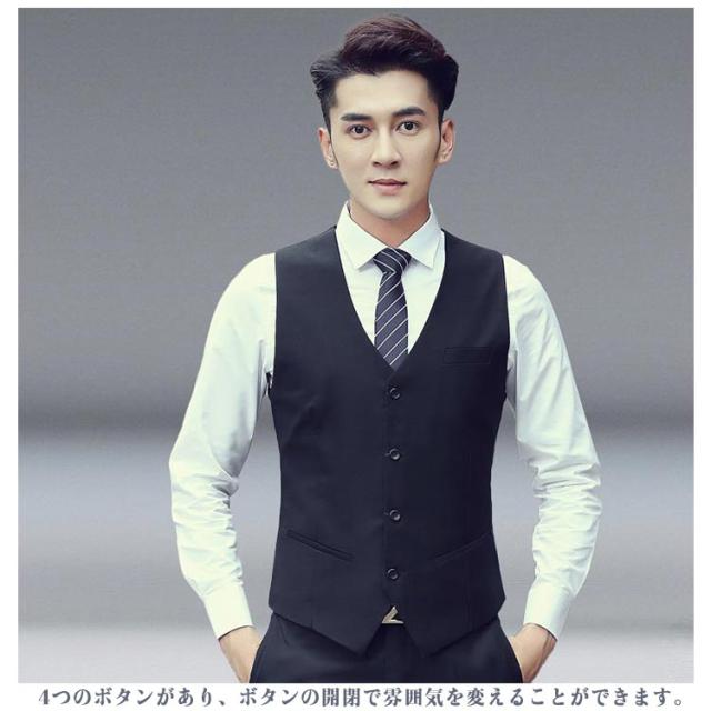 | 羽織るだけでドレスアップ!メンズ用のジレベスト 4つのボタンがあり、ボタンの開閉で雰囲気を変えることができます。 すっきりとしたシルエットがスマートな印象を与える、着やせ効果も抜群! ジャケットのインナーとしてもこ着用いただけます。 スーツやジャケットと合わせてワンラック上のお洒落な格上げスタイルに。 ロングシーズンで大活躍する1着です。 | |