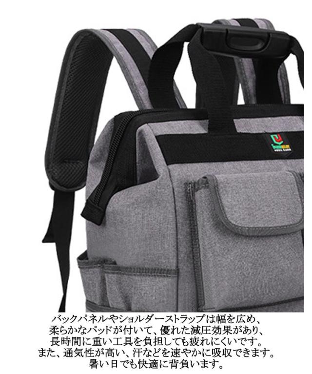 | リュック型大容量ツールバッグ。【強化底部、自立機能】【15ポケット】 リュックデザインなので、普通の手提げのツールバックに比べてより楽に持ち運びできる。 豊富なポケットとホルダーでたっぷり収納、すっきり整理できる。小型工具から電動工具まで収納可能です。 6000D高密度オックスフォードを採用しています。強化縫製でしっかりと仕上げられ、耐荷重、耐摩擦、耐久性に優れてます。 バックパネルやショルダーストラップは幅を広め、柔らかなパッドが付いて、優れた減圧効果があり、長時間に重い工具を負担しても疲れにくいです。また、通気性が高い、汗などを速やかに吸収できます。暑い日でも快適に背負います。 工具入れバッグは様々な道具や工具の収納、携帯に、仕切りがついており大変便利です。ガーデニング、釣り、工芸、建築、大工、請負業者、屋根、ラインマン、石工、鉄工などの作業を携わる人に最適にします。日常生活のDIY活動だけでなく、自動車修理、木工および専門な修理活動も最適です。 | |