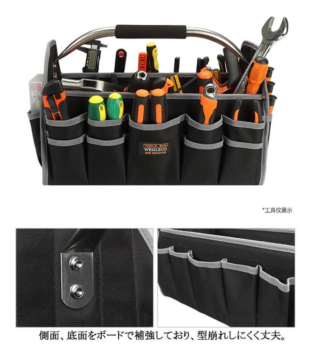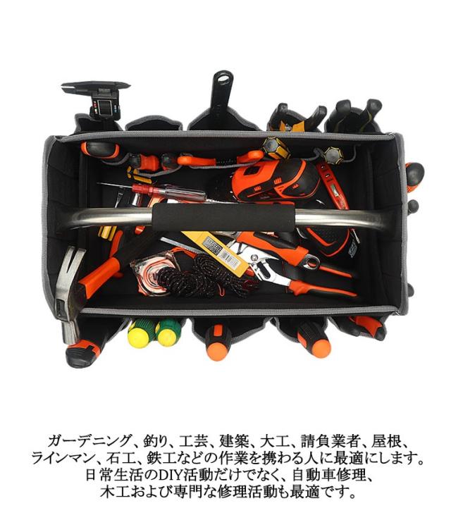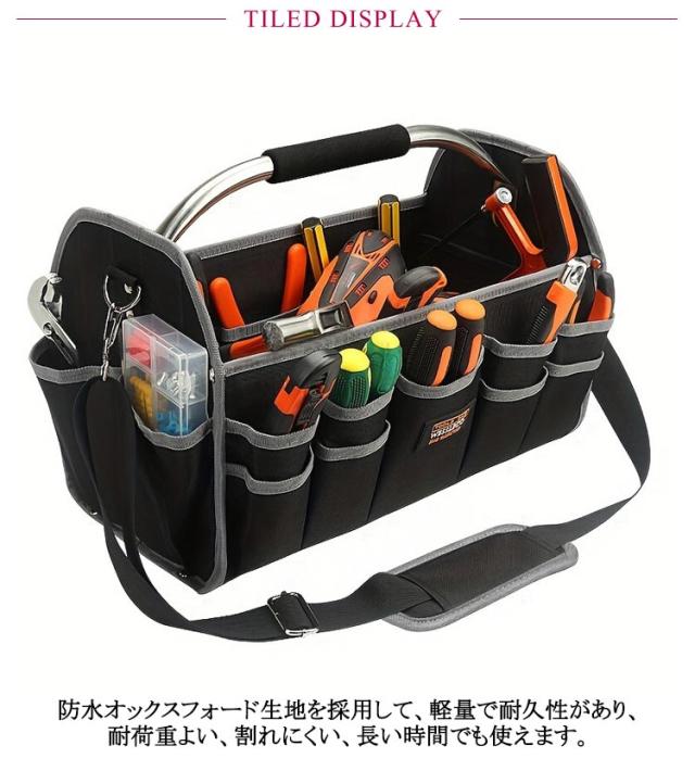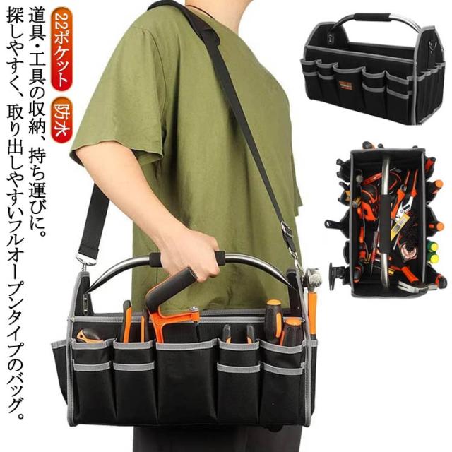 | 道具・工具の収納、持ち運びに。探しやすく、取り出しやすいフルオープンタイプのバッグ。【22ポケット】 ステンレスパイプハンドルと肩掛けベルトで持ち運び楽々。 豊富なポケットとホルダーでたっぷり収納、すっきり整理できる。 側面、底面をボードで補強しており、型崩れしにくく丈夫。 また底鋲付きで地面に置く時も汚れにくい。 防水オックスフォード生地を採用して、軽量で耐久性があり、耐荷重よい、割れにくい、長い時間でも使えます。 ガーデニング、釣り、工芸、建築、大工、請負業者、屋根、ラインマン、石工、鉄工などの作業を携わる人に最適にします。日常生活のDIY活動だけでなく、自動車修理、木工および専門な修理活動も最適です。 | |