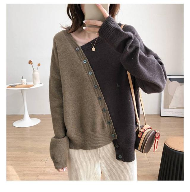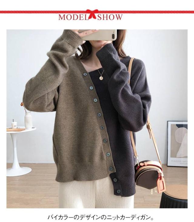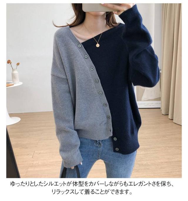 トップス バイカラー おしゃれ キレイめ レディース ニット ゆったり セーター 長袖 春服 カーディガン カーディガン アシメトリー 配色 可愛い