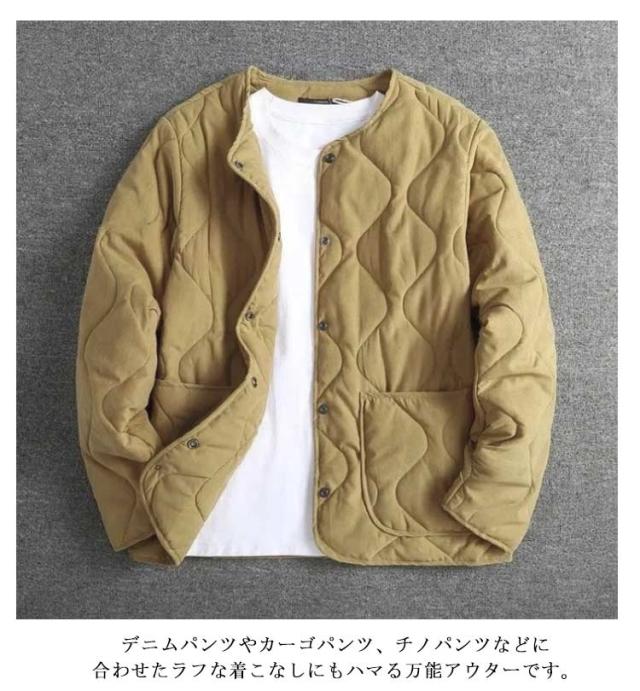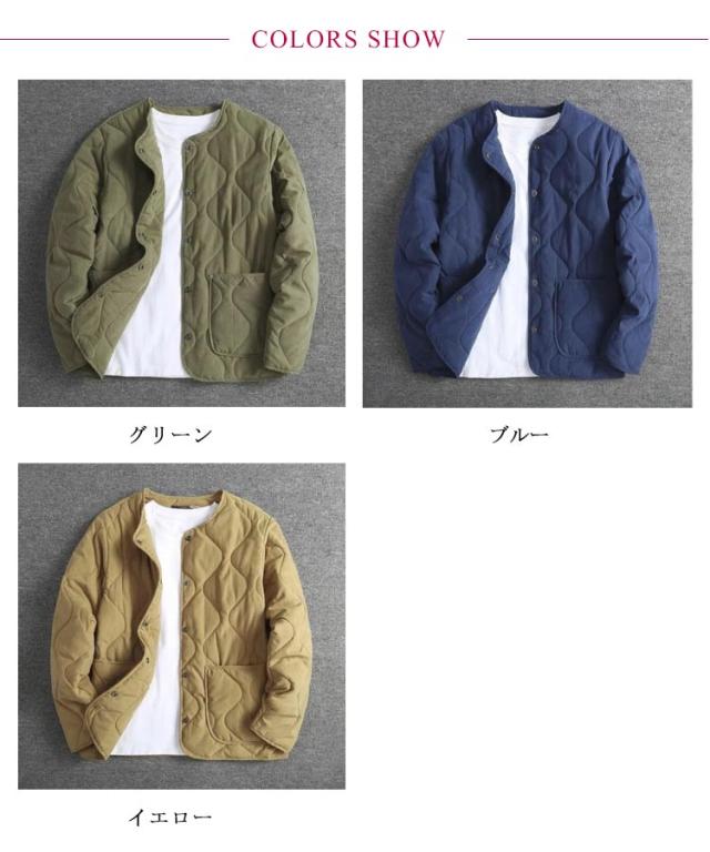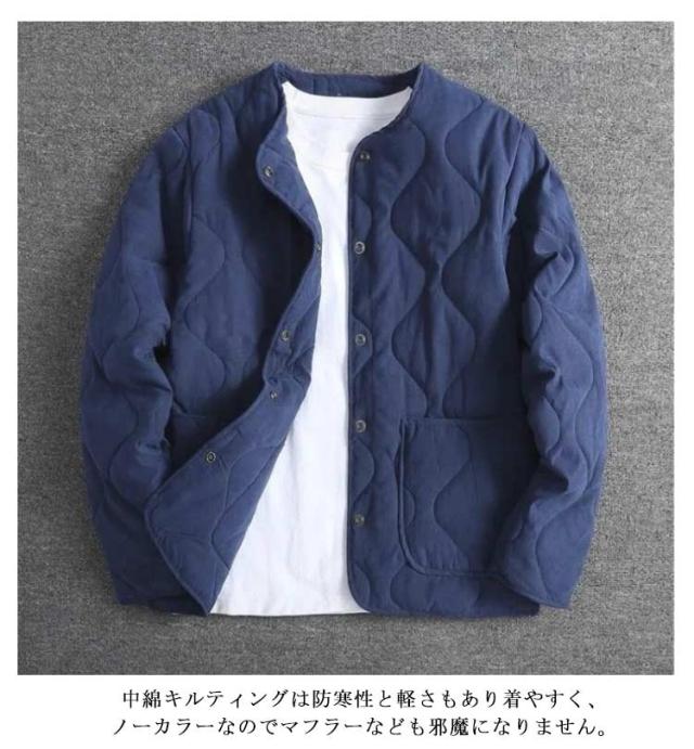 ノーカラージャケット メンズ ノーカラーキルティングジャケット 中綿 ノーカラー コート アウター ジャケット 長袖 羽織り キルティングコート ブルゾン ミリタリー カジュアル ゆったり ライトアウター キルティングジャケット 防寒 保温 春 秋 冬