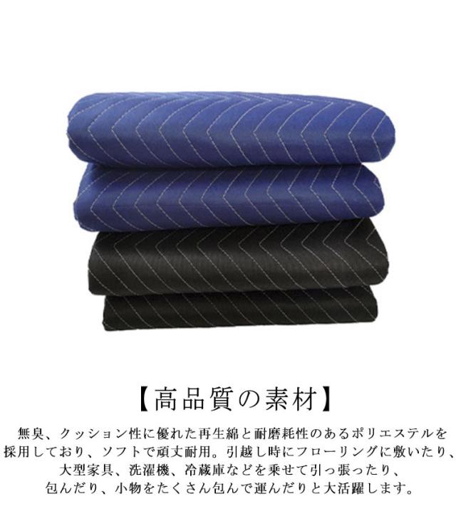| 引っ越しのプロのために開発大き目サイズと適度な厚さがあり、持ち運びも軽く、使いやすいです。 【広い用途】引っ越し&運搬時の荷物保護・室内作業時の床の傷防止・DIY時の敷物・車のトランク養生&車中泊用のマット、ピクニック、キャンプなどの敷物として活用できます。 【耐久性のある構造】しっかりとした縫製 で丈夫で破れにくく、見た目も清潔感があり、安心してご利用いただけます。 【高品質の素材】無臭、クッション性に優れた再生綿と耐磨耗性のあるポリエステルを採用しており、ソフトで頑丈耐用。引越し時にフローリングに敷いたり、大型家具、洗濯機、冷蔵庫などを乗せて引っ張ったり、包んだり、小物をたくさん包んで運んだりと大活躍します。 | |