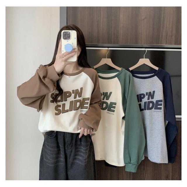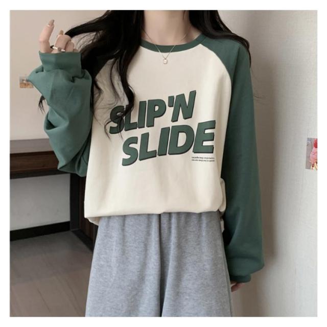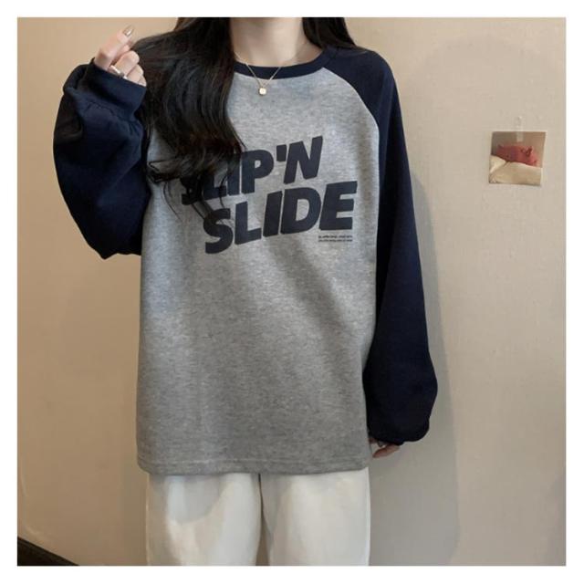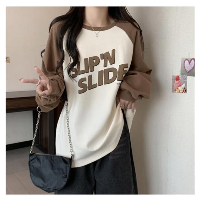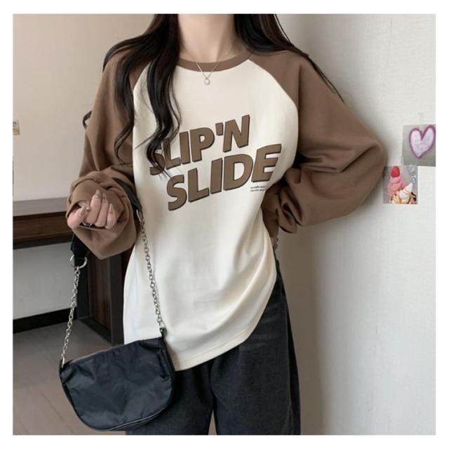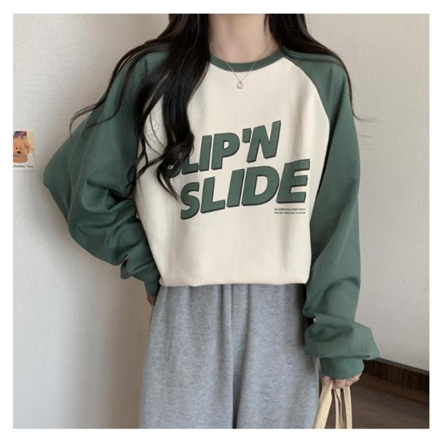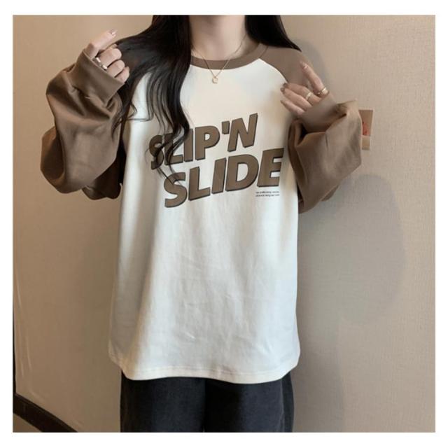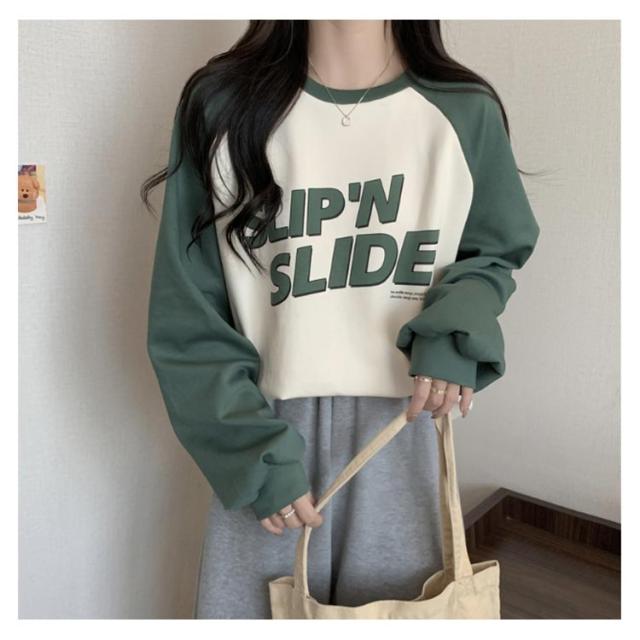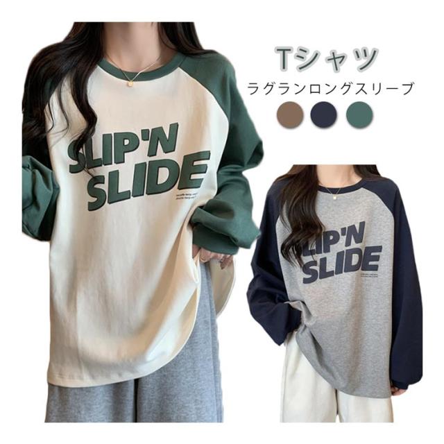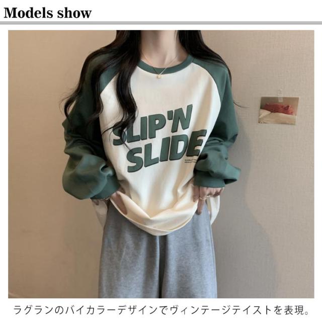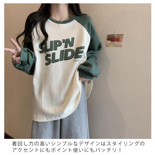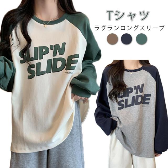 長袖 厚手 袖リブ ロンT プルオーバー ラグランTシャツ バイカラー ロングスリーブ クルーネック カットソー プリント トップス 英字 長袖 透けない 春
