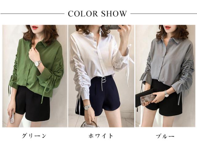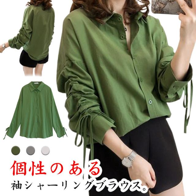 袖シャーリング ブラウス 袖シャーリング シャツワンピースブラウス トップス レディース ブラウス きれいめ オフィスカジュアル リボン ドロスト 袖コンシャス ギャザー袖 かわいい オフィス 通勤 通学 OL 前開き 襟付き トップス
