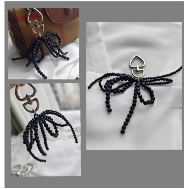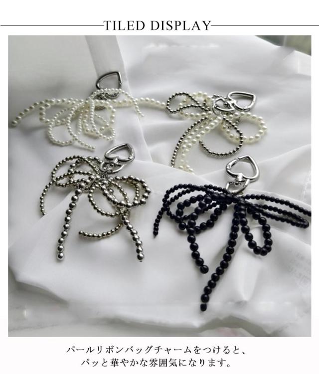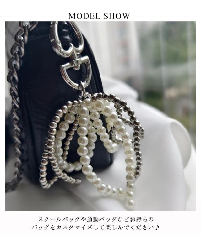 リボンチャーム バッグチャーム ハート型カラビナ付き アクセサリー チャーム キーホルダー パール リボン チャーム ストラップ パール調 鞄 バックチャーム 蝶結び 可愛い 韓国ファッション 白 黒 シルバー