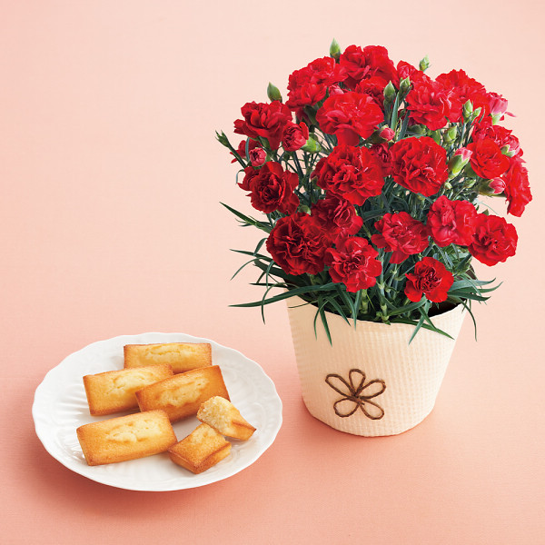 内容:カーネーション(4号鉢)、バスケット●お手入れのしおり付●フィナンシェ×5