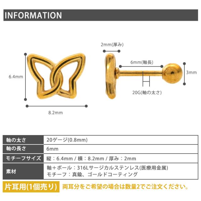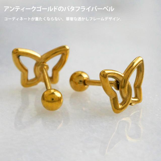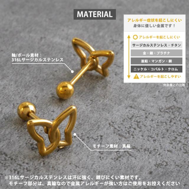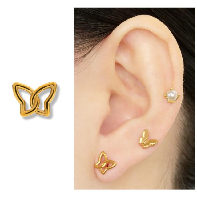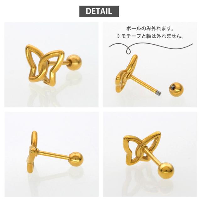 透かしデザインがモダンなバタフライモチーフストレートバーベル。 シンプルなフォルムが使いやすい。 太さは普通のピアスと同じ20Gなので、どなたでもお使いいただけます。 軸とボール部分はサージカルステンレス製ですが、モチーフは真鍮製ですので、アレルギーの強い方はお控えください。