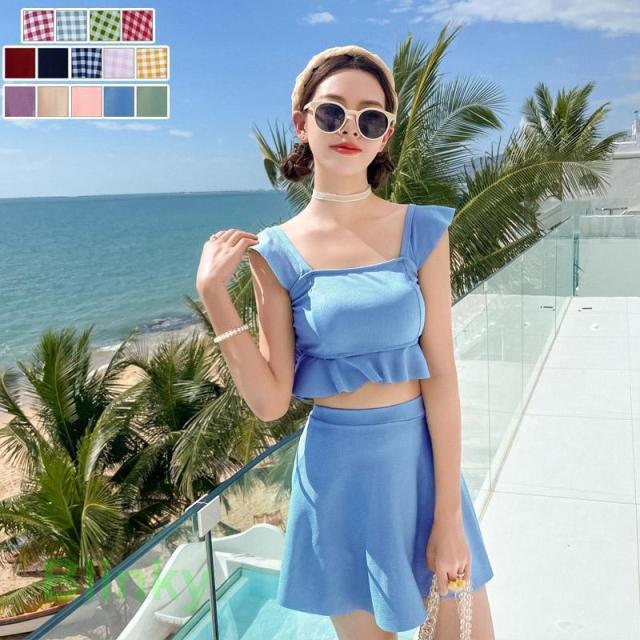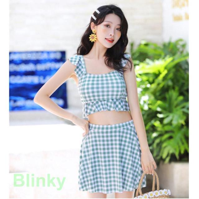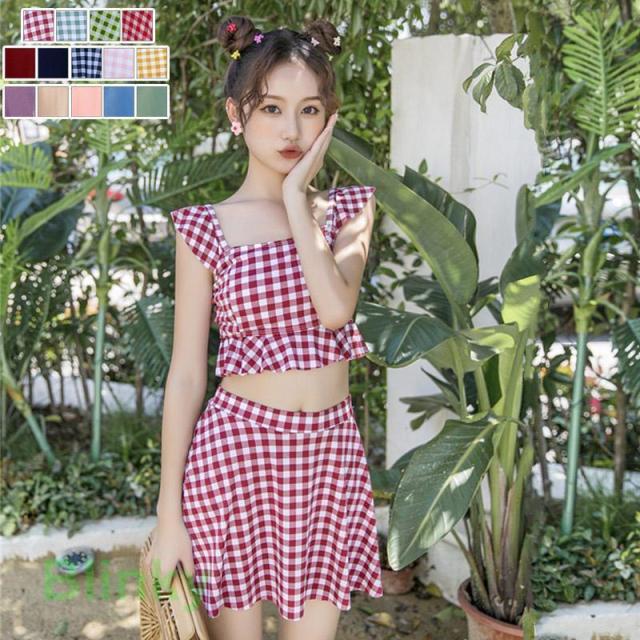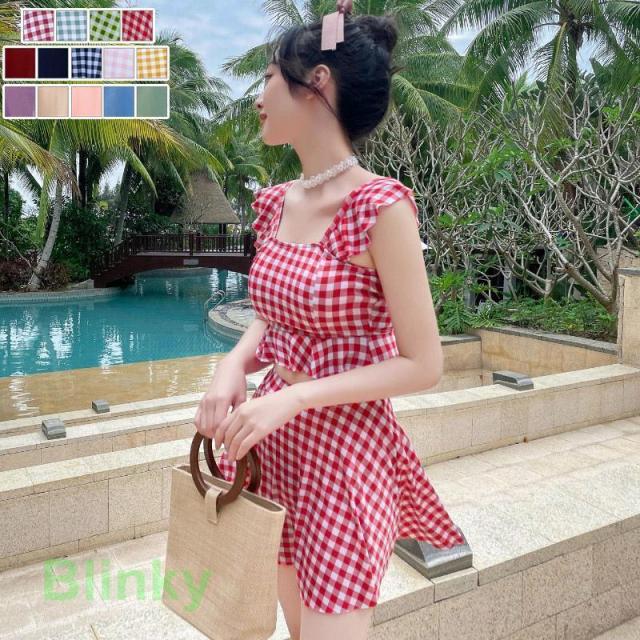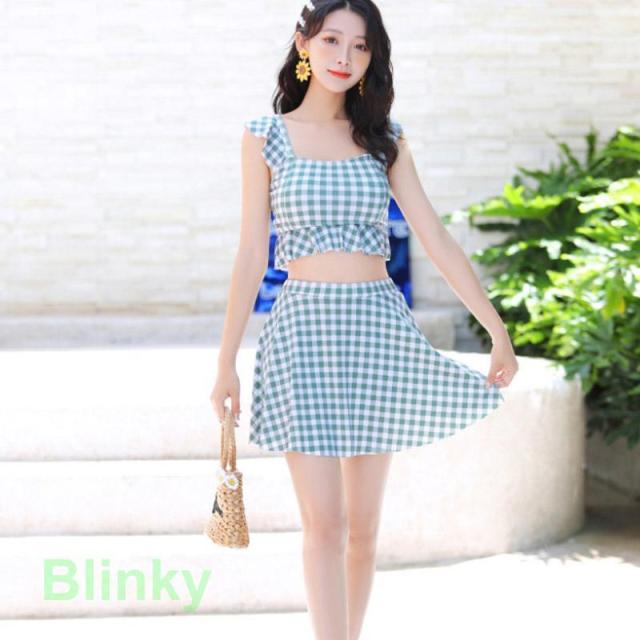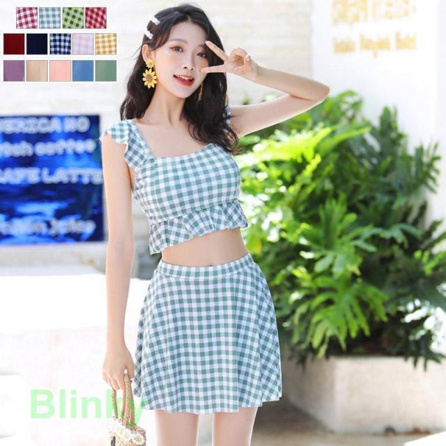 水着 レディース 体型カバー ビキニ ハイウエスト 2点セット ストライプ柄 ママ水着 かわいい ギンガム チェック柄 フレア フリル