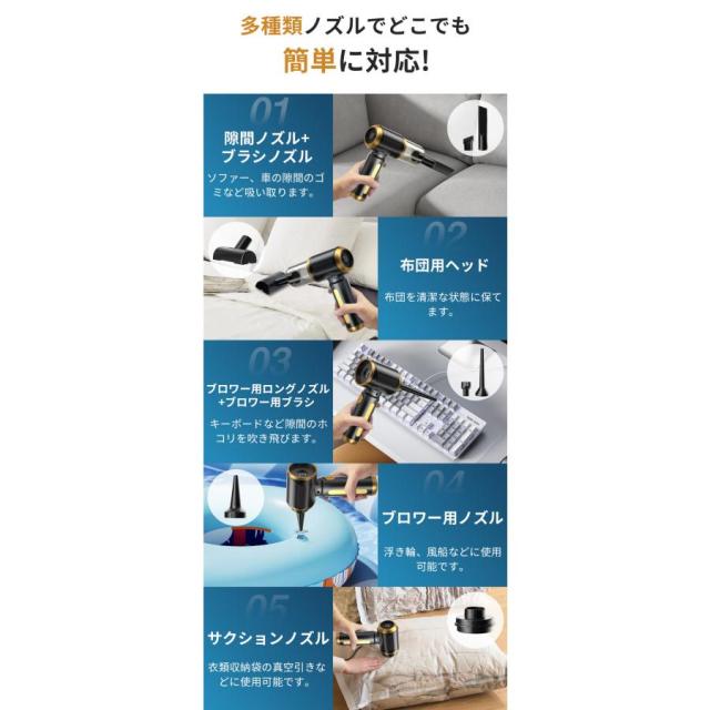 【多機能掃除機】本掃除機は一台を持ってミニ掃除機・エアダスター・電動エアーポンプとして利用可能です。吹き飛ぶ/吸い込む/空気入れ/空気抜きなどの機能が付き、付属のアタッチメントは用途に合わせて、ソファの隙間、キーボード、車内掃除、エアベッド、エアボート、専用衣類圧縮袋などの場合に使用可能です。