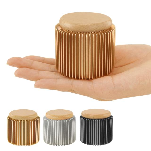 ・【かわいいミニ骨壷素材とサイズ】 ??本体材質:アルミ製+然木ブナ材無垢、手触り感もよく、木の暖かさを感じさせます。??骨壺サイズ:外寸法:直径6.5cm×高さ5.5cm/内部収納有効寸法:直径約4.0cm×高さ約3.5cm ??1gのプラスチック計量スプーンと15~20g透明ボトル付き。両手でそっと温めるように持つことができる、丸みのあるフォルムミニ骨壷。スカイグレー、シルバー、シャンパン三つの色で、部屋の雰囲気に応じてお好みな色を選ぶましょう。