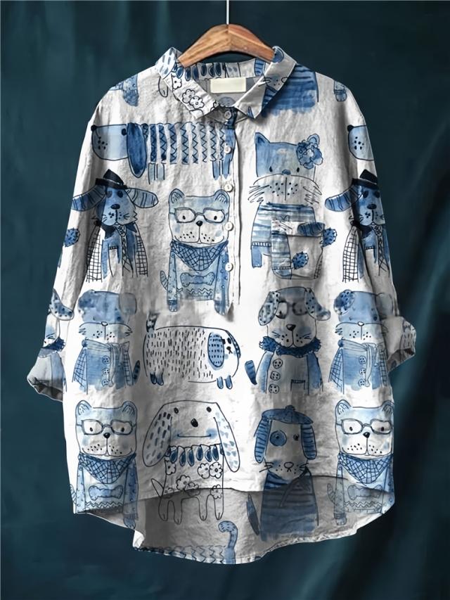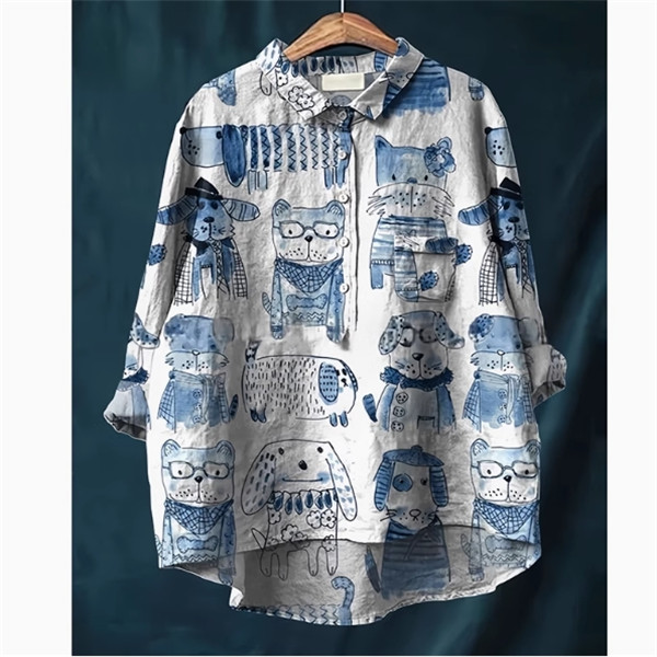 シャツ レディース トップス チュニック丈 可愛い犬柄 ブラウス オーバーサイズ 長袖 羽織り漫画柄 春秋 オーバーシルエット ラフスタイル 大きいサイズ