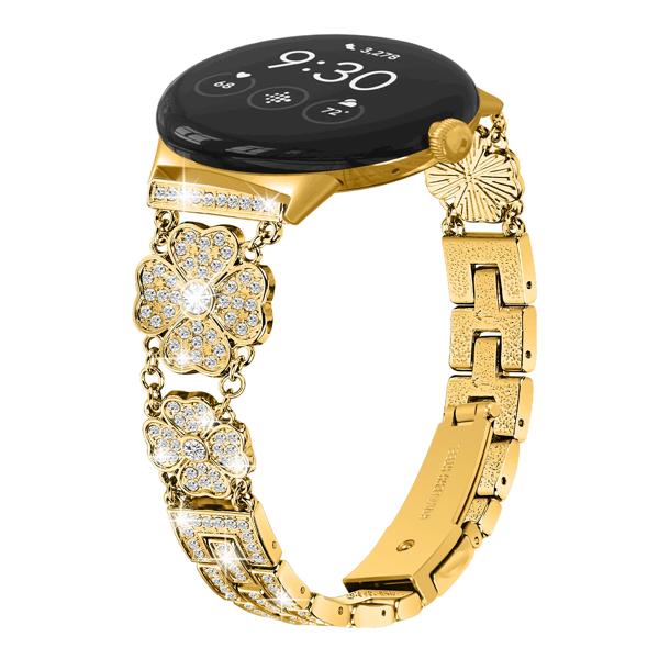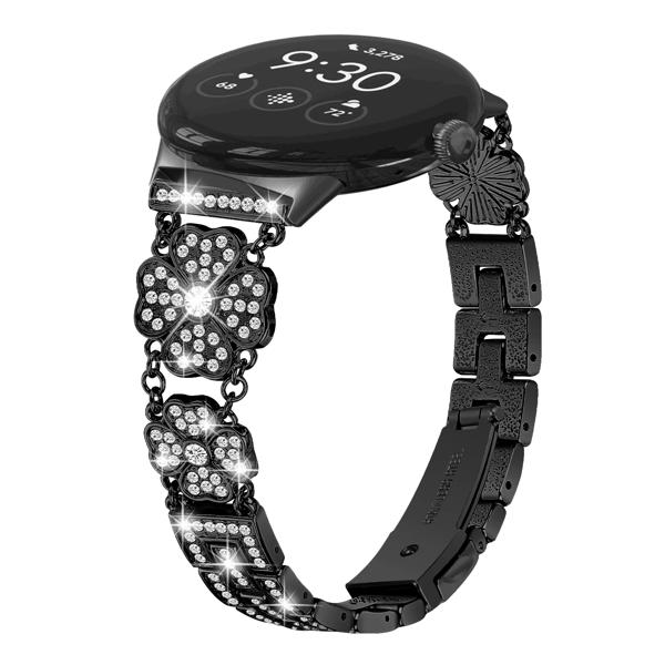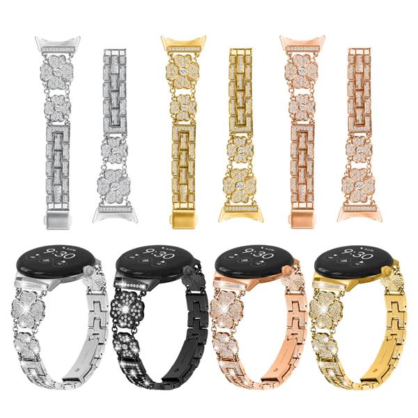 GooglePixelウォッチ用ステンレススチールストラップ、時計バンド、クローバーフラワー、ダイヤモンドメタル、女性用ブレスレットアクセサリー