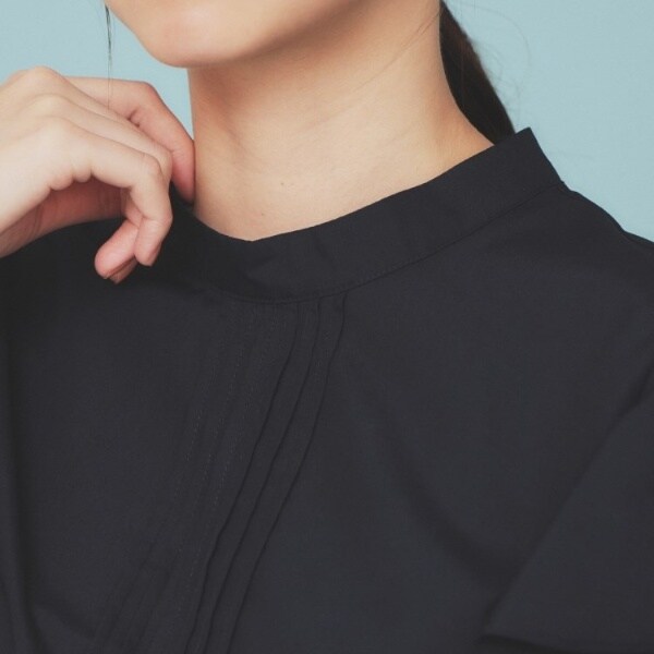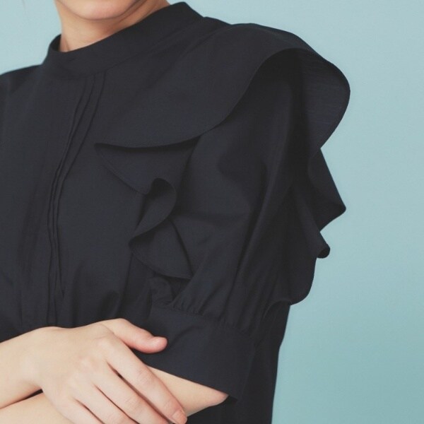ハイネックにピンタックと綺麗なフリルスリーブが特徴のデザインブラウス