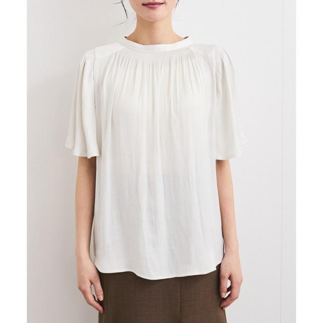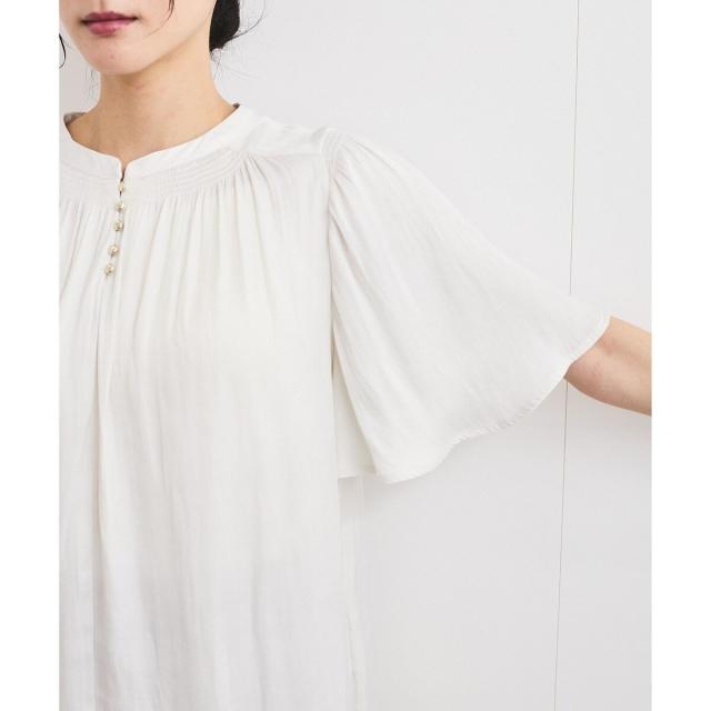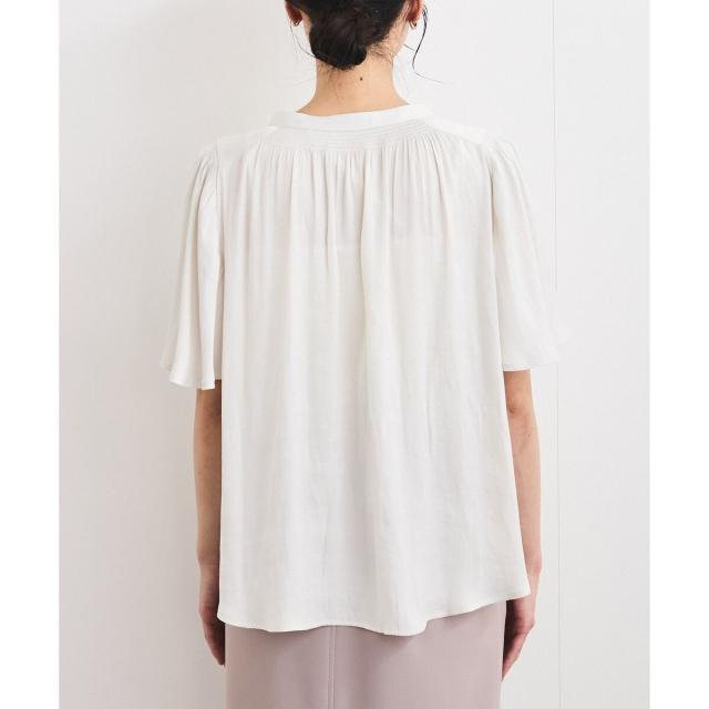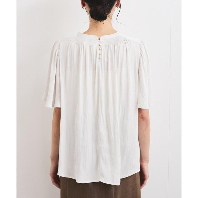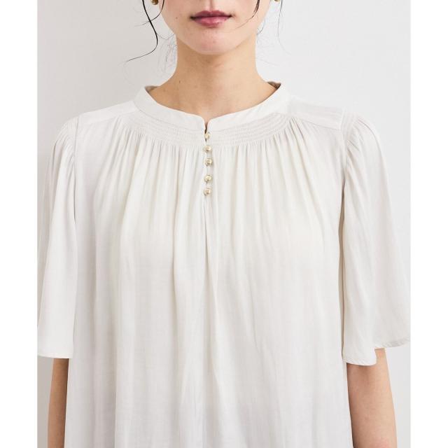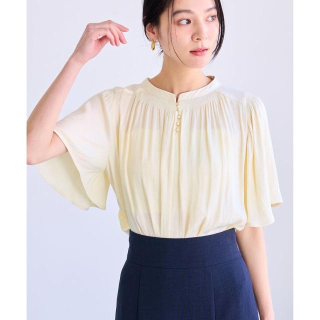 衿ぐりと袖山にシャーリングを入れて、ゴールド釦でさりげないアクセントをつけたシンプルながらもフェミニンブラウスです。