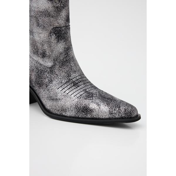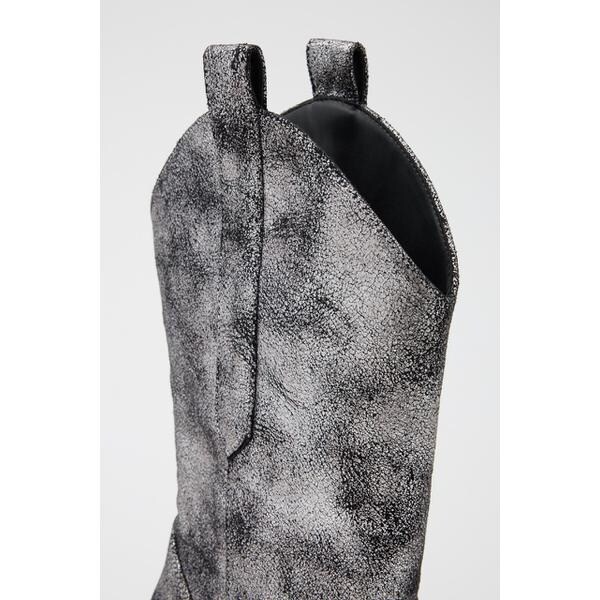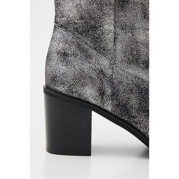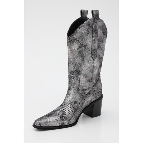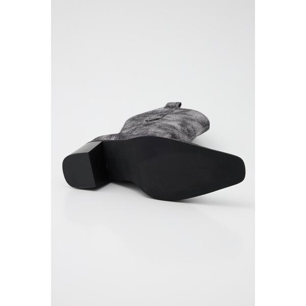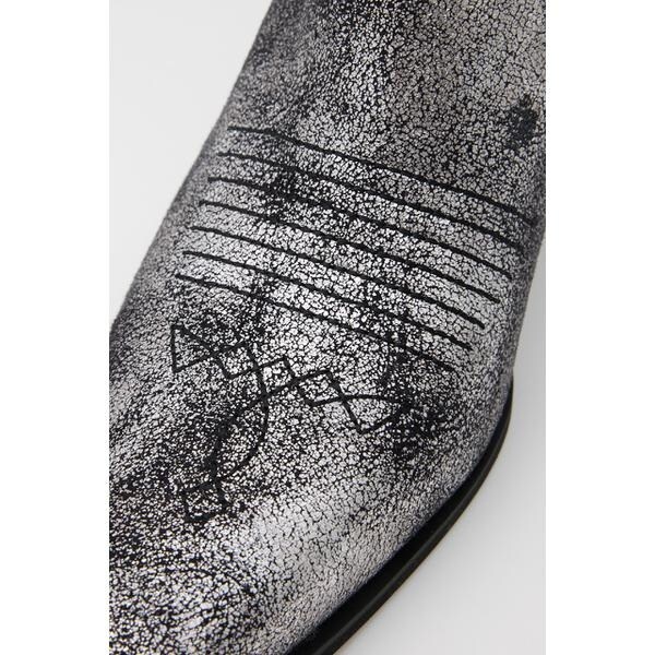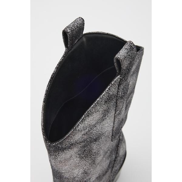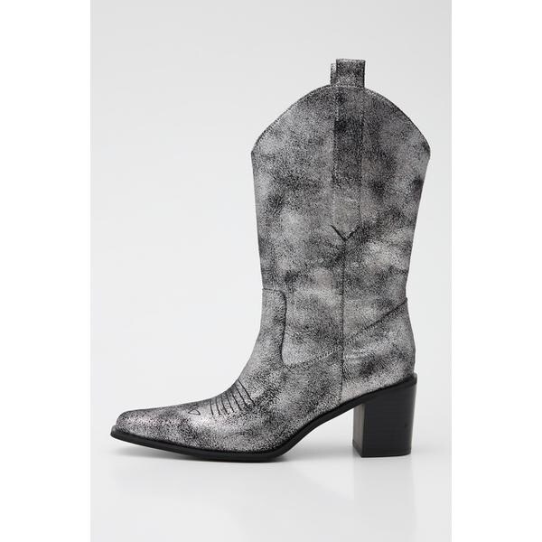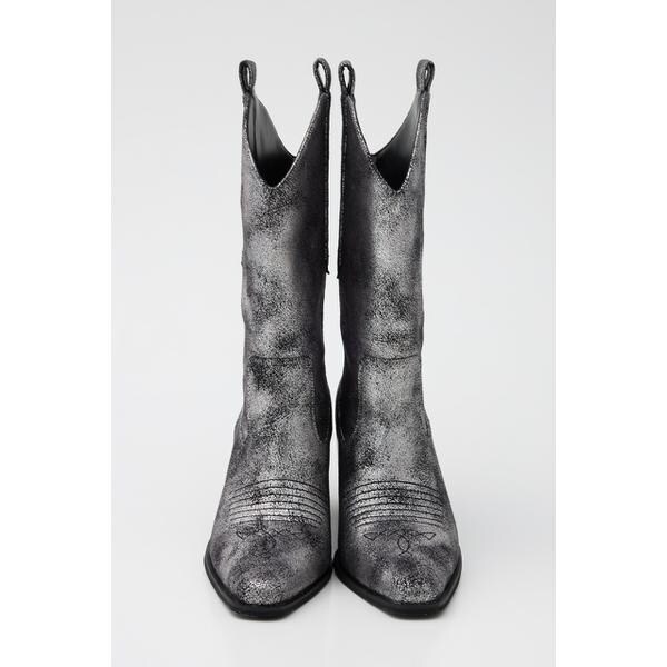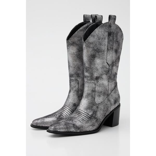 【MIDDLE WESTERN BOOTS】■POINT:トレンドのポインテッドトゥのミドルウエスタンブーツ。■DETAIL:ポインテッドトゥに程よくウエスタンデザインを取り入れているので、履くだけでシックな印象に。ヒールも安定感があり、程よい傾斜なので歩きやすく、履き口もきつ過ぎないので着脱しやすいです。■STYLING:今季トレンドのシルバーは、お手持ちのワンピースやデニムスタイルに合わせるだけでポイントに。ブラックも雰囲気のあるエイジング加工を施しているので、今っぽさがありながらも、デイリーに合わせやすく、長く愛用できるアイテムです。【BLK】独特な風合いが特性の素材を使用しています。色落ちや色ムラがあり、使用とともにさらに表面変化が見られる場合がありますが、製品の特徴としてご理解いただき、風合いをお楽しみください。ご着用の際に組み合わせ衣料に色落ちする場合がありますので、濃淡の組み合わせはご注意下さい。【SLV】表面の箔プリントは永久的なものではなく、使用の繰り返しで剥離することがあります。過度な摩擦(特に湿潤時)はお避け下さい。高温多湿の場所に保管しないでください。※商品画像はサンプルのため、色味やサイズ、素材の混率等の仕様に変更がある場合がございますので、予めご了承ください。※一部予約商品につきましては生産上の都合によりお届け予定日や店頭発売と前後する場合もございます。※追加生産商品は、一部の店舗、通販で販売中の場合がございます。予めご了承下さい。