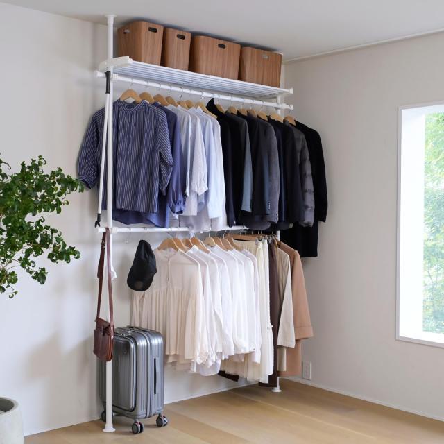 【タテのスペースを有効活用】突っ張って設置するので場所をとらず、天井近くのデッドスペースまでタテの空間を有効活用できるハンガーラックです。伸縮棚はハンガーバーの上段もしくは最下段どちらにも取り付け可能でお好みで選べます。