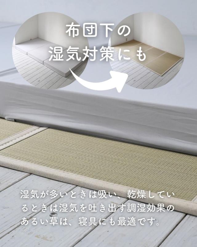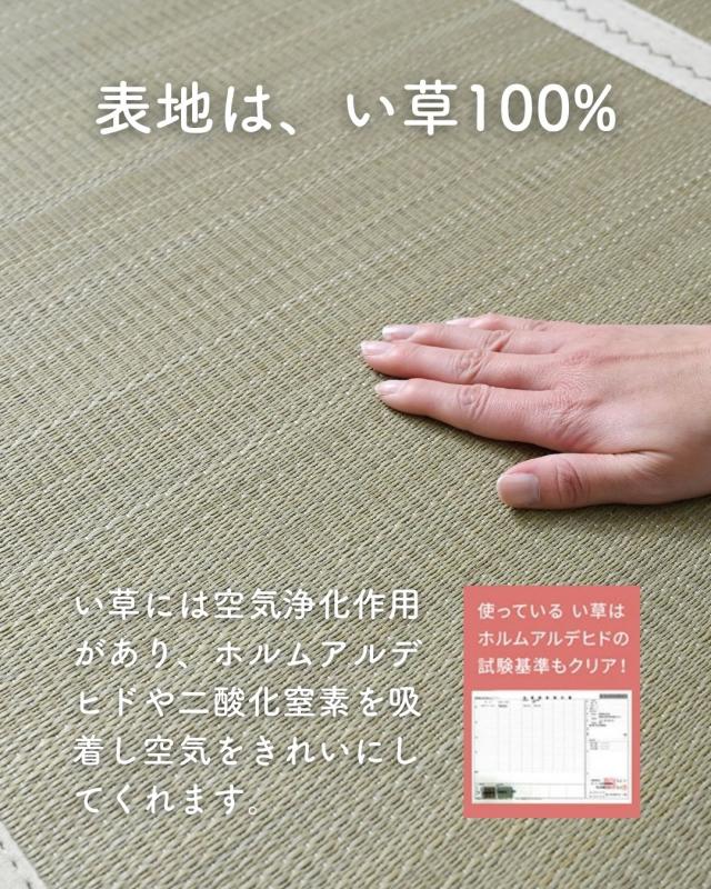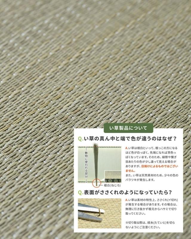 | 材質 | 表地: い草100% 中材: ポリエステル(フェルト) 縁布: 綿・麻 裏地: 不織布 |