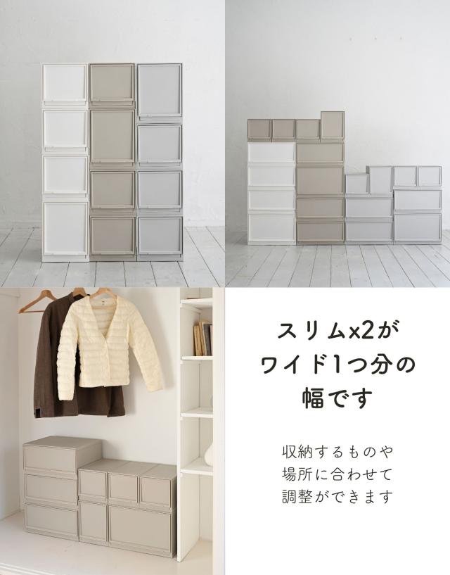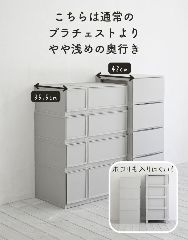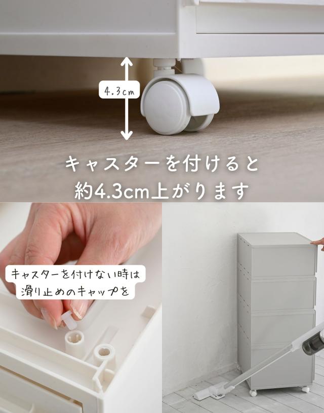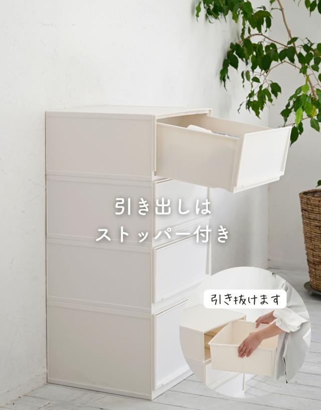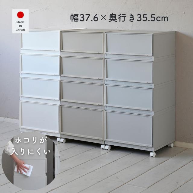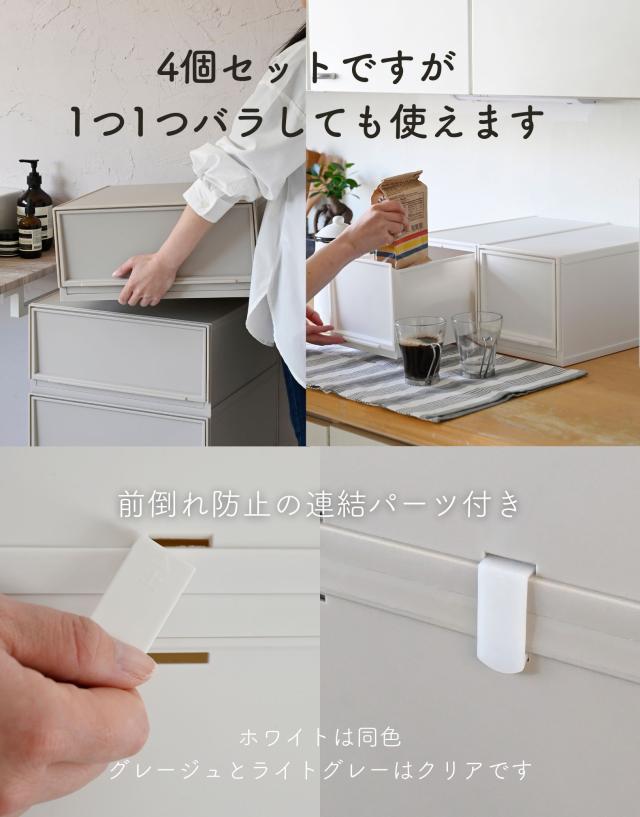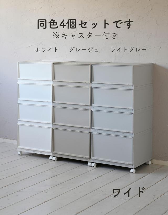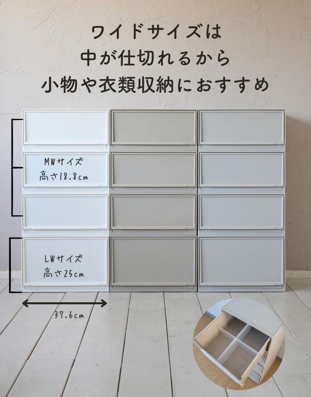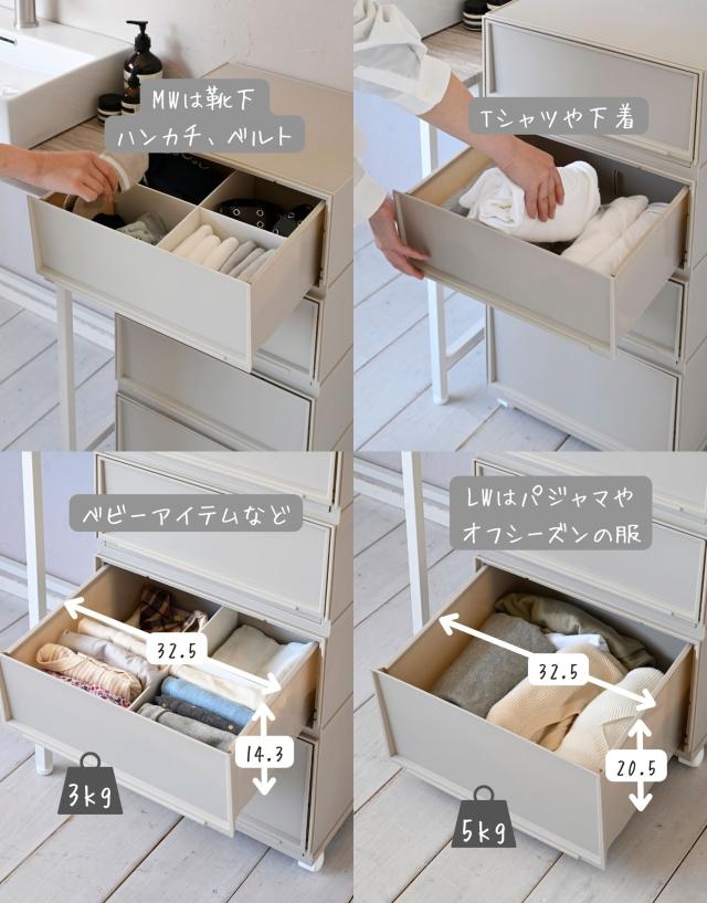| 商品説明 | ●クローゼットや洗面所、リビングや机の上など、おうちのあらゆる場所で使える中が透けないプラスチックタイプ ●ホコリが入りにくい側面と裏面 ●MWサイズ3個とLWサイズ1個の合計4個セット ●取り外し可能なキャスター付き ●スムーズな開閉の引き出し ●引き出しはストッパー付きで、引き出し過ぎてもズレ落ち防止 ●引っかかりのないスムーズな開閉 ●スタッキング時にずれ防止の連結パーツ付き ●キャスターを使わない時用の滑り止めも付属 ●キャスターの高さ:4.3cm ●キャスター取り付け時の耐荷重: 10kg ●【MWサイズ】 ●1個当たり 幅37.6×奥行き35.5×高さ18.8cm 重量1.45kg ●十字に仕切るとハンカチや靴下などの小物収納にぴったりなMサイズ ●仕切りを外すとTシャツやパンツ、服の収納に適切な深さ ●CDの収納目安: 2列で約60 ●内寸: 幅14.3×奥行32.6(間口25.6)×高さ14.3cm ●耐荷重: 3kg ●仕切り2枚(グレージュ、ライトグレーはクリアです) ●【LWサイズ】 ●1個当たり 幅37.6×奥行き35.5×高さ25cm 重量1.67kg ●タオルやオフシーズンの洋服を入れやすいLサイズ ●DVDの収納目安: 2列で約40枚 ●内寸: 幅14.3×奥行32.6(間口25.6)×高さ20.5cm ●耐荷重: 5kg ●仕切り2枚(グレージュ、ライトグレーはクリアです) |