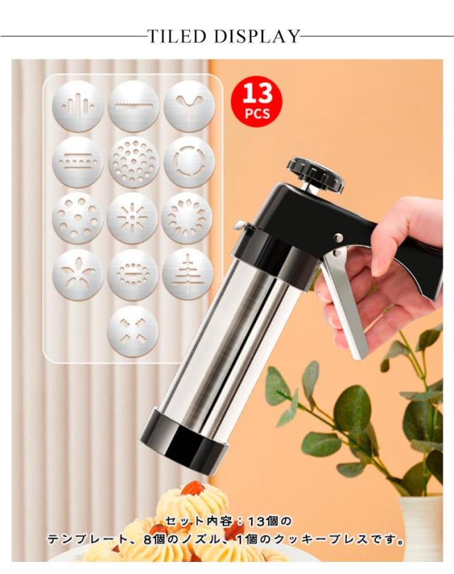 | 初心者でも簡単に操作できる手作りケーキの基本セットです。 セット内容:13個のテンプレート、8個のノズル、1個のクッキープレスです。 人間工学に基づいた設計により、片手で快適に操作できます。 さまざまな形状のクッキーディスクで、色々なデコレーションが楽しめます。 多種類の花型絞り口が揃っていますのでお好みによって組み合わせて、クッキーやケーキなどにいいデコレーションをしましょう! ステンレスで作られており、錆びにくく丈夫で長持ちします。 クッキーの手作り、生クリームやチョコレートなどを絞るにも便利なツールです。 | |