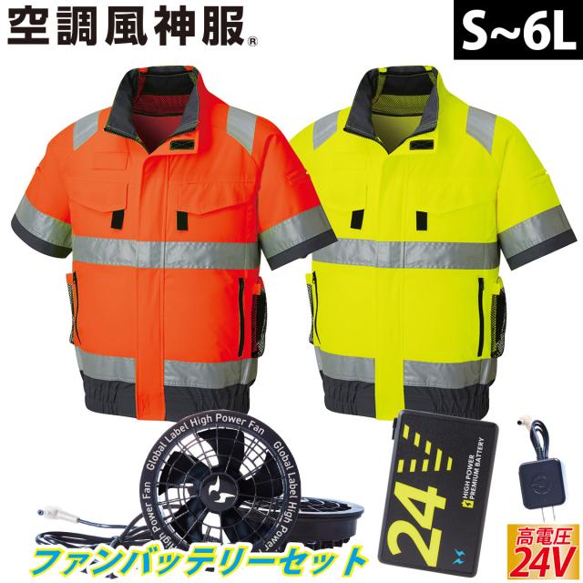 2025年新商品 空調風神服 フルハーネス対応Hi-Vis半袖ブルゾン KF92520G 海外製24Vバッテリーファンセット RD9580G RD9530H サンエス 夜間作業 安全服 電動ファン用ウェア 空調作業服 再帰性反射材 SUNS