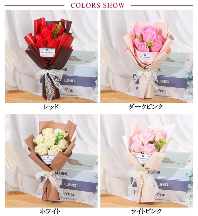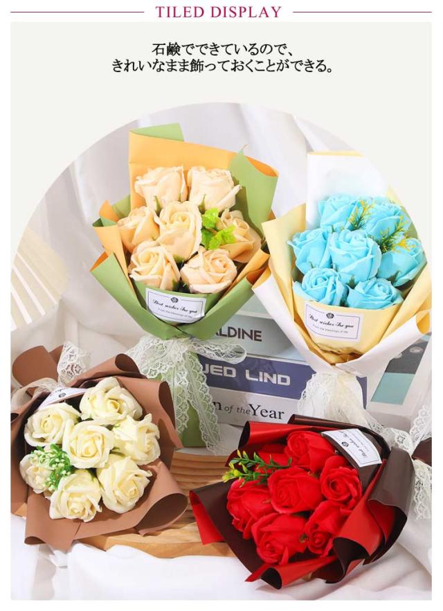 | 石鹸できたお洒落なシャボンブーケ。お手入れのいらない枯れないお花 石鹸でできているので、きれいなまま飾っておくことができる。 見た目の華やかさからプレゼントとして人気です。 枯れない為、お手入れ不要、長くお楽しみ頂けます。 | |