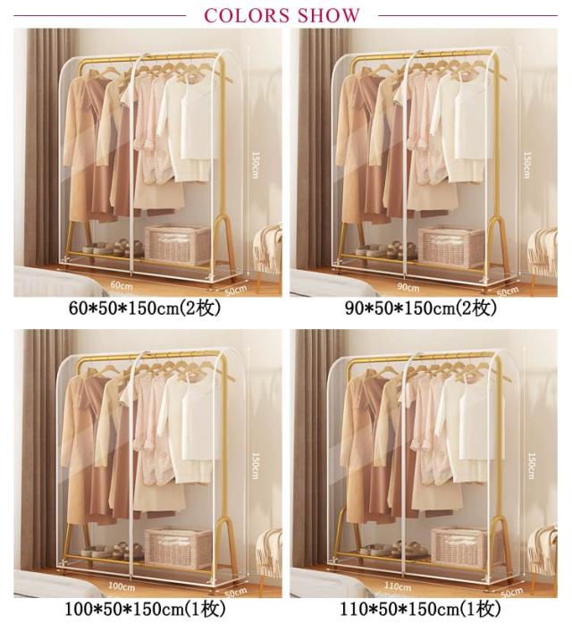 | クローゼット内や、ハンガーラックに掛けた洋服をホコリからガード!【透明?半透明2タイプ】【幅60cm−200cm選べる】【2枚セット】 幅60−200cm*高さ150cm、PEVAで作られて、お大切な服をホコリ、カビ、湿気、虫や汚れからしっかり守って、服を型崩れないし、衣類を大事に保管できます。 ハンガーラックカバーの真ん中にファスナー付き、開閉がボタンタイプのより便利です。 日常服や制服、スーツなどをパイプハンガーに掛け、そしてカバーを覆うと何日が経っても汚れないし、服を取るや掛けるのも邪魔なしで行えます。 透明?半透明なので中身が見える。 使わないときは折りたたんでコンパクトに収納可能。 | |