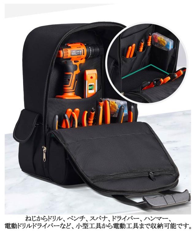 | 工具・道具・資材等の収納、持ち運びに便利なリュック型ツールバッグです。【底鋲付き、自立機能】 リュックデザインなので、普通の手提げのツールバックに比べてより楽に持ち運びできる。 豊富なポケットとホルダーでたっぷり収納、すっきり整理できる。小型工具から電動工具まで収納可能です。 1680D高密度オックスフォードを採用しています。強化縫製でしっかりと仕上げられ、耐荷重、耐摩擦、耐久性に優れてます。 バックパネルやショルダーストラップは幅を広め、柔らかなパッドが付いて、優れた減圧効果があり、長時間に重い工具を負担しても疲れにくいです。また、通気性が高い、汗などを速やかに吸収できます。暑い日でも快適に背負います。 また底鋲付きで地面に置く時も汚れにくい。 ねじからドリル、ペンチ、スパナ、ドライバー、ハンマー、電動ドリルドライバーなど、小型工具から電動工具まで収納可能です。 電工、大工、木工、内装、電気工事、修理、配線、配管、建築、鉄工などを務める色々な職人に適用されます。 工事現場や建設現場などで使用するのがメインですが、DIYの広まりから一般家庭に使われるケースも多いです。 | |