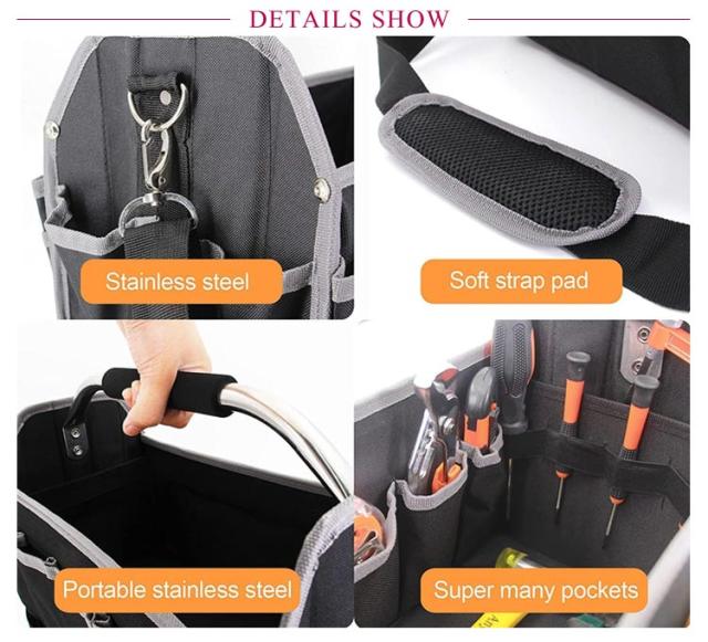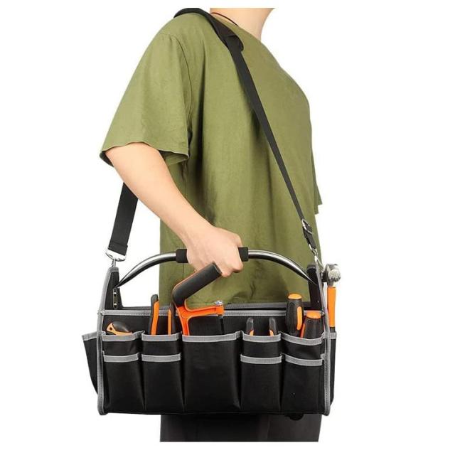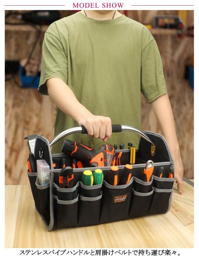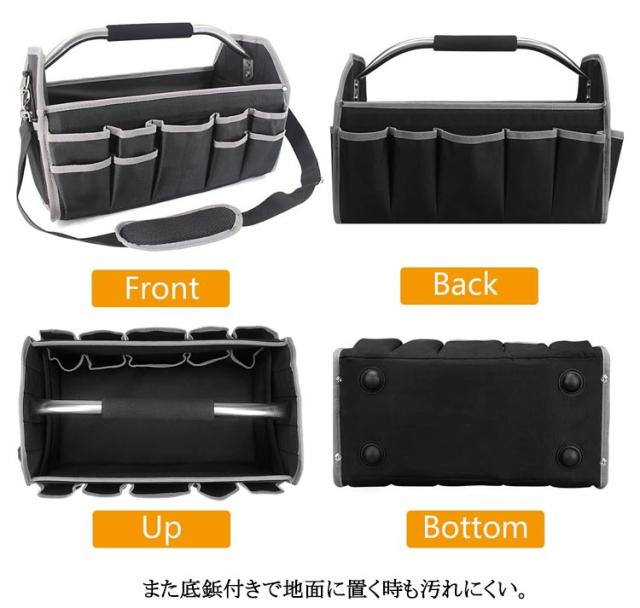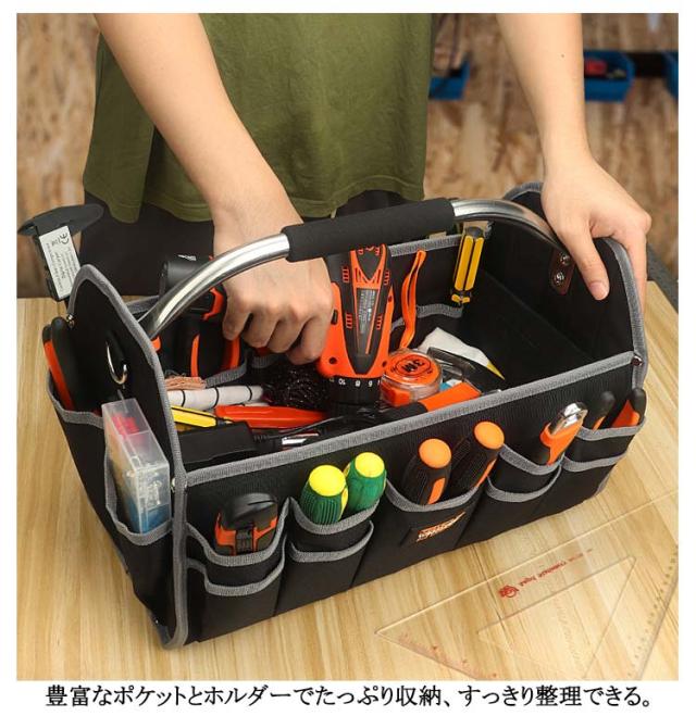 | 道具・工具の収納、持ち運びに。探しやすく、取り出しやすいフルオープンタイプのバッグ。【22ポケット】 ステンレスパイプハンドルと肩掛けベルトで持ち運び楽々。 豊富なポケットとホルダーでたっぷり収納、すっきり整理できる。 側面、底面をボードで補強しており、型崩れしにくく丈夫。 また底鋲付きで地面に置く時も汚れにくい。 防水オックスフォード生地を採用して、軽量で耐久性があり、耐荷重よい、割れにくい、長い時間でも使えます。 ガーデニング、釣り、工芸、建築、大工、請負業者、屋根、ラインマン、石工、鉄工などの作業を携わる人に最適にします。日常生活のDIY活動だけでなく、自動車修理、木工および専門な修理活動も最適です。 | |