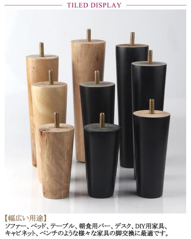 | 天然木の家具交換用脚。【4本セット】【高さ5cm?6cm?8cm?10cm?12cm?15cm?18cm?20cm】 家具の交換用脚は高品質の天然木で作られており、環境に優しく健康的で、ホルムアルデヒドや汚染がなく、家具の脚の表面は磨かれて滑らかで、無垢材の家具はあらゆる家の装飾スタイルに適しています。 【機能】円錐形固定脚は家具を支え、地面から離して湿気を防ぎ、掃除を容易にします、必要に応じてオリジナル家具の高さを変えて、生活をより便利にすることもできます。 【幅広い用途】ソファー、ベッド、テーブル、朝食用バー、デスク、DIY用家具、キャビネット、ベンチのような様々な家具の脚交換に最適です。 【簡単設置、強力な耐荷重】ボルト式の家具脚はねじ込み式の取り付け方法を採用しており、交換が非常に便利です、4本の脚は強力な耐荷重性と優れた安定性を備えており、一般的に使用される家具に適しています。 | |
