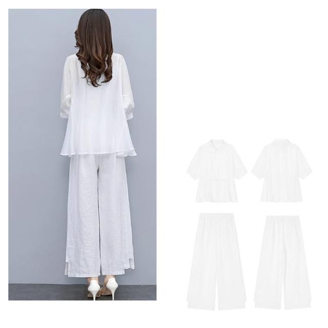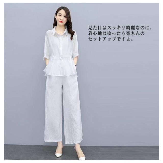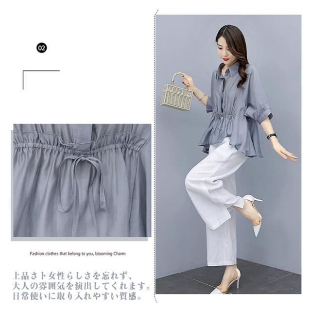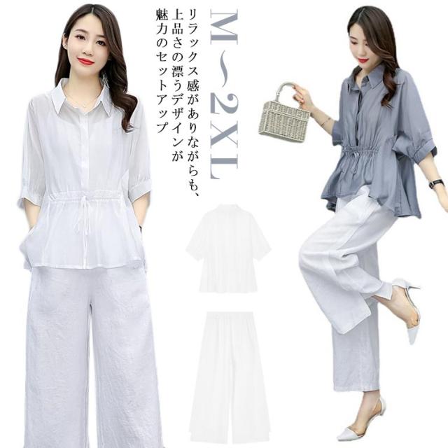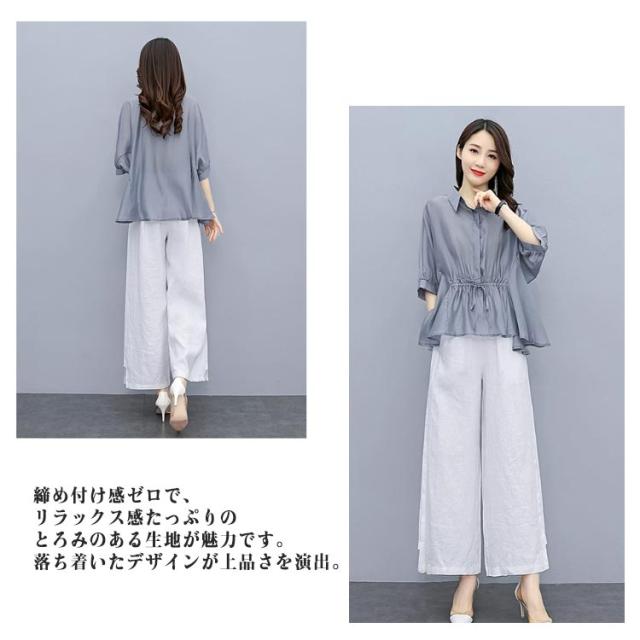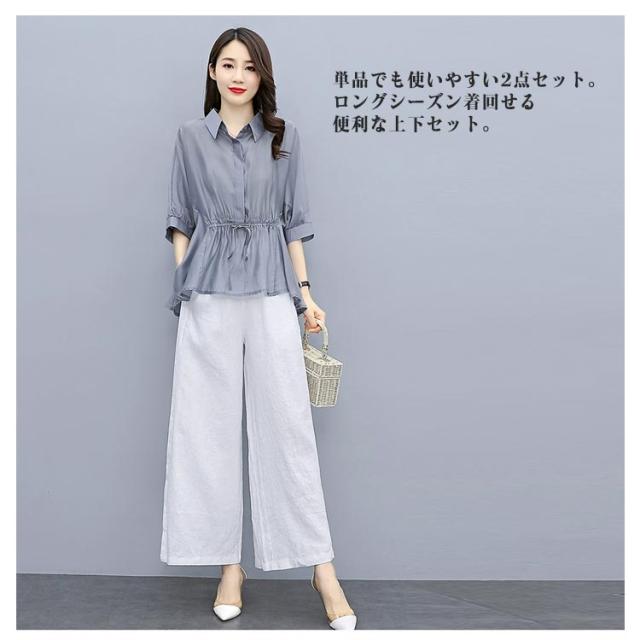 春秋 レディース 軽量 カジュアル ブラウス ワイドパンツ 薄手 ゆったり 7分袖 ワ上下セット 春 セットアップ 夏 ロングパンツ きれいめ カジュアル シンプル セットアップ おしゃれ 大きいサイズ 大人女性 体型カバー 通勤