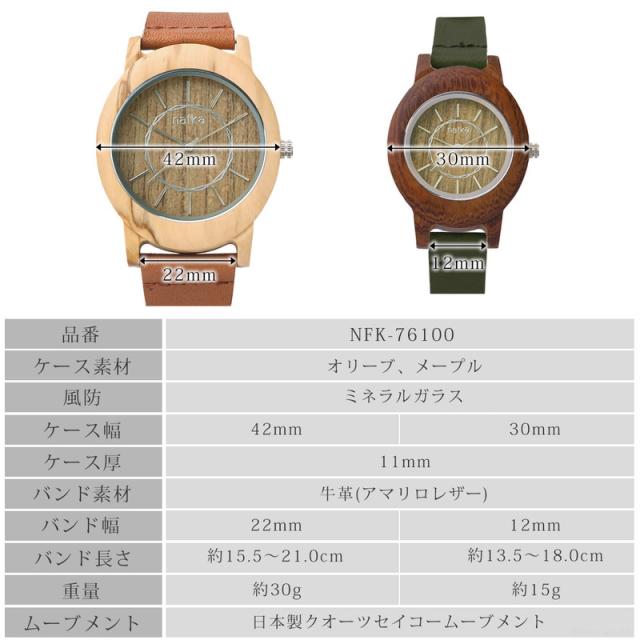 腕時計 レディース メンズ ユニセックス ウッドウォッチ ペアウォッチ luonto ルオント 木製 ウッド メープル オリーブ ナチュラル 天然木 本革 牛革 アマリロレザー クオーツ 日本製セイコームーブメントnafka ナフカ【NFK-76100】ブランド 人気