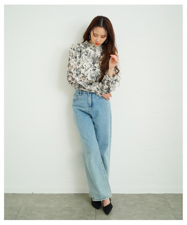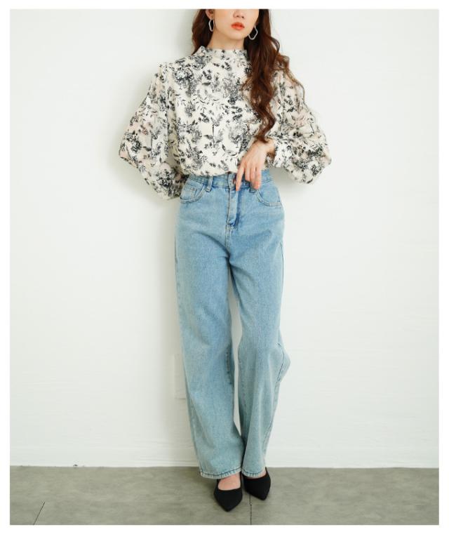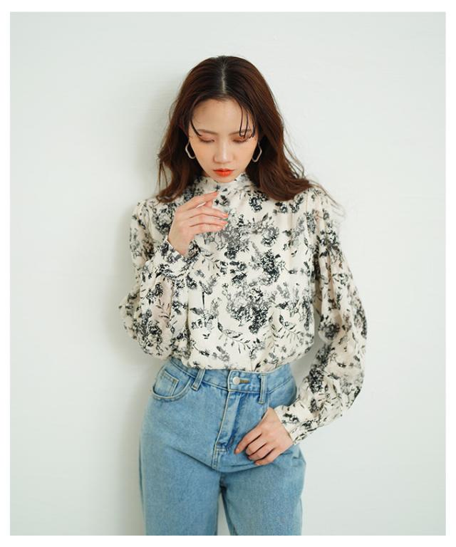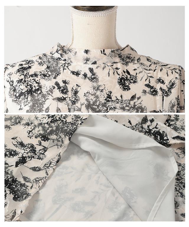 特徴: シアー パフスリーブ ジャガード ハイネック リボン