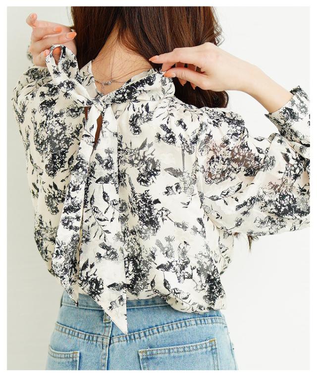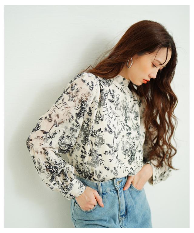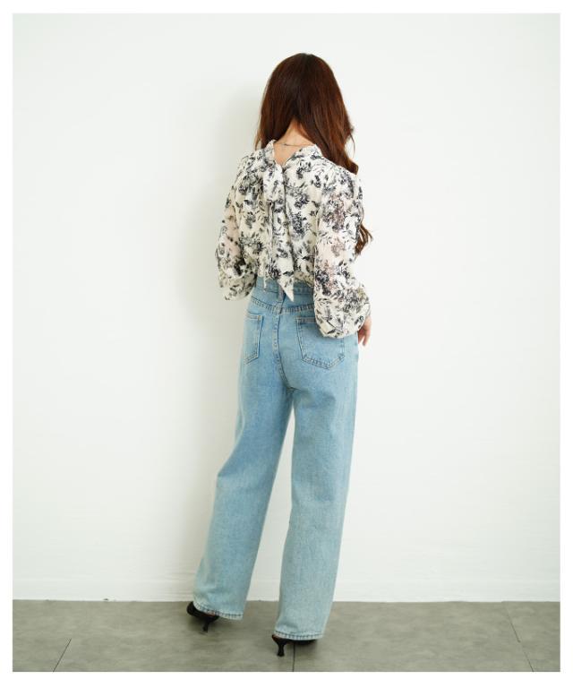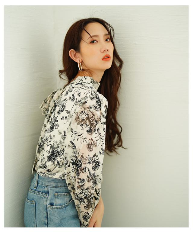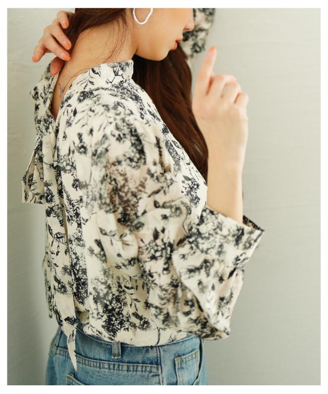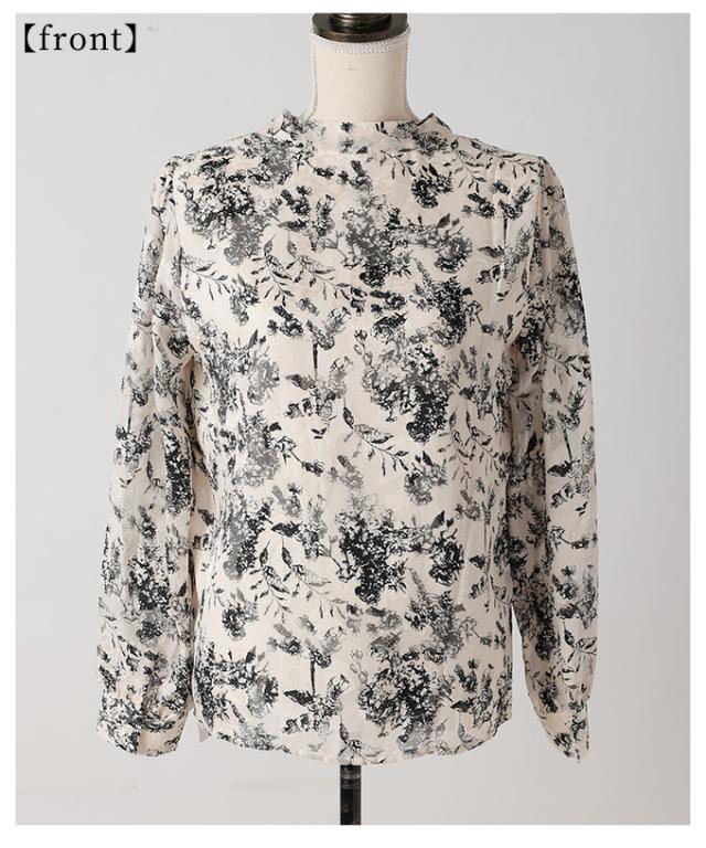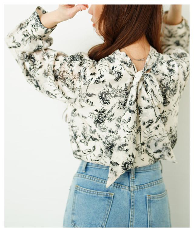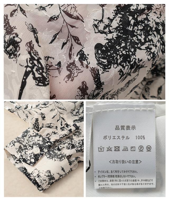 商品名: バックリボンのボタニカル柄シアーシャツブラウス