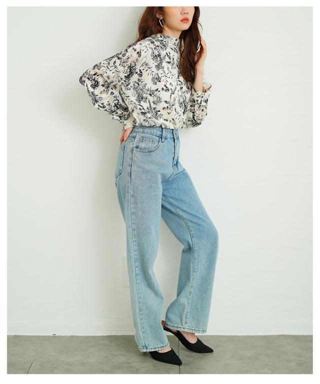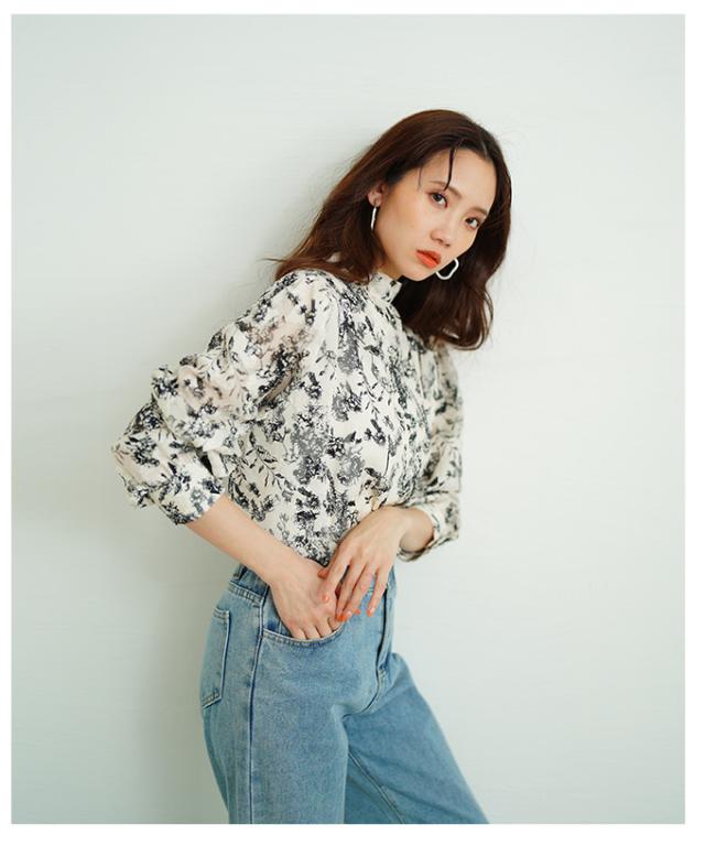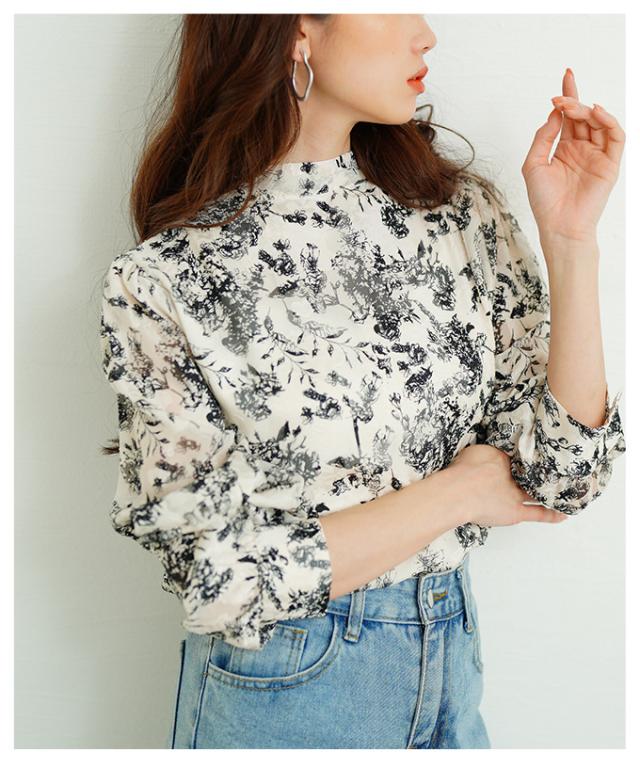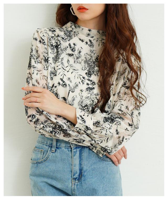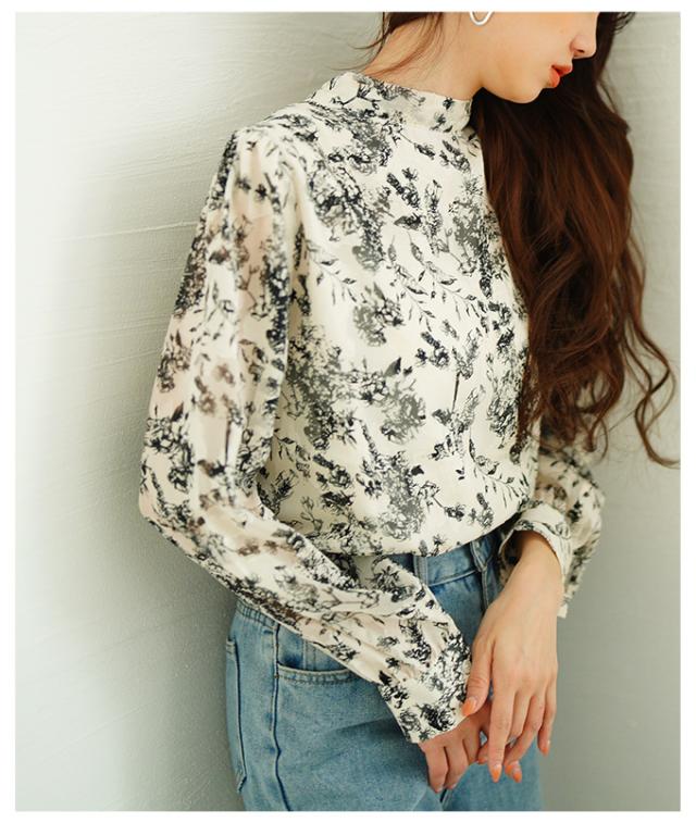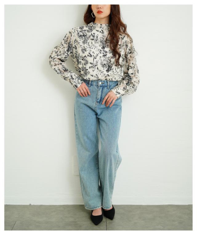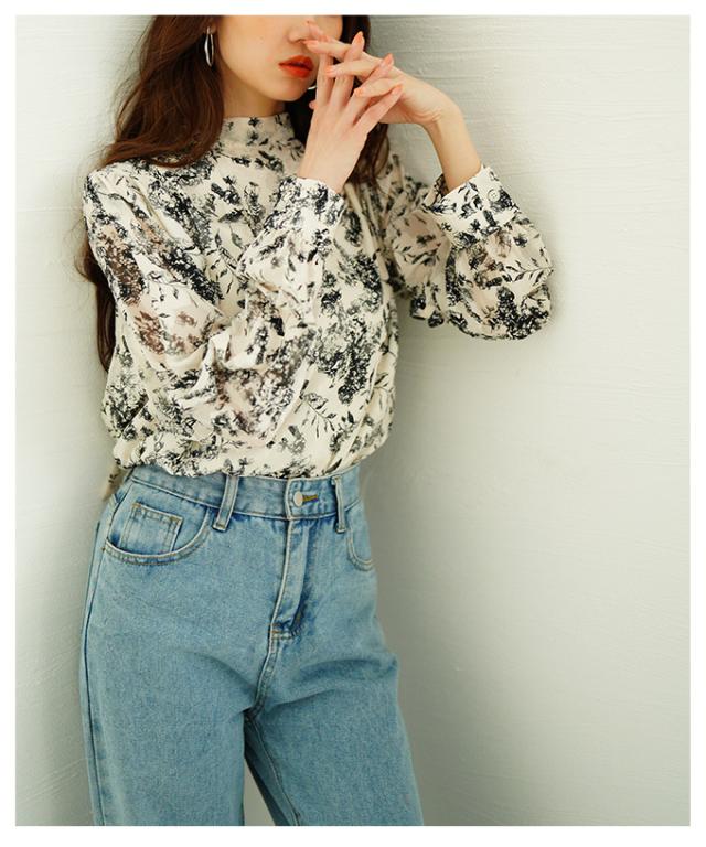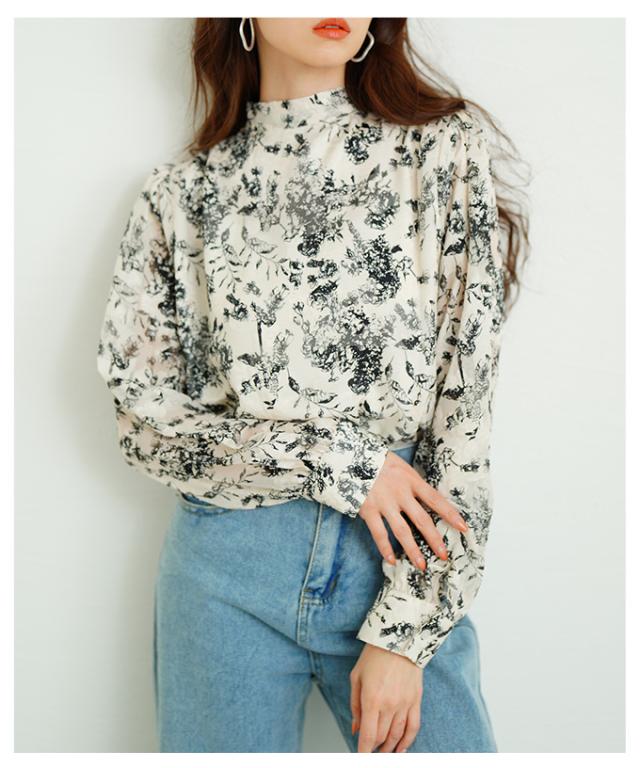 商品名: バックリボンのボタニカル柄シアーシャツブラウス