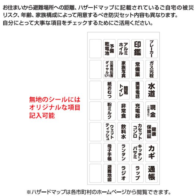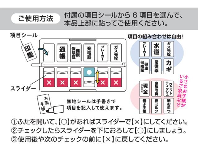 防災士監修、チェック項目シール付きで、施錠確認・ブレーカーOFF・常備薬の持参など、避難時に大切な行動をひと目で確認できます。