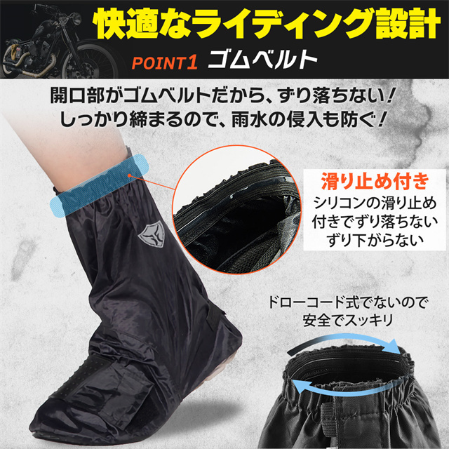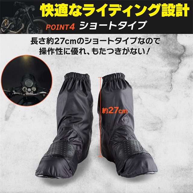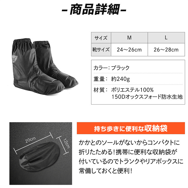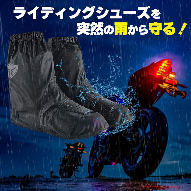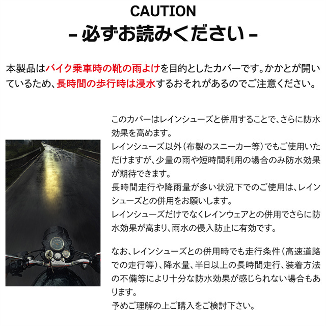 | 特徴 | ◆日常生活で大活躍する、バイク用レインシューズカバー。 ◆突然の雨でも安心。コンパクトで折りたためるので携帯便利。 ◆かかとオープン型なので着脱が楽。幅広面ファスナーでお好みのフィット感に調整できる。 ◆優れた防水性。撥水性&通気性に優れた防水150Dオックスフォード生地採用。防風防寒対策にも◎ ◆開口部はシリコン滑り止め付きのゴムベルトなのでズレやずり落ちなく、ドローコード式でないので足回りスッキリ。 ◆シフトガード付きなのでペダル操作での傷を防止。シフトガードはアジャスターで調整可。 ◆かかと部分にはリフレクターがついているので夜間も安心。 ◆長さ約27cmのショートタイプなので、もたつきなく操作性に優れています。 ◆携帯便利な収納袋付。トランクやリアボックスに常備しておくと突然の雨でも慌てません。 ◆本製品はバイク乗車用の雨よけです。歩行も可能ですが長時間の歩行は浸水するのでご注意ください。 ◆本製品はレインシューズカバーですのでレインシューズと併用することで防水効果を高めます。布製のスニーカー等で ご使用いただいた場合、短時間や少量の雨の場合のみ防水効果が期待できます。 ◆また、レインシューズと併用した場合であっても走行条件や装着の不備等により十分な効果が感じられない場合もあります。予めご理解の上購入を検討下さい。 |