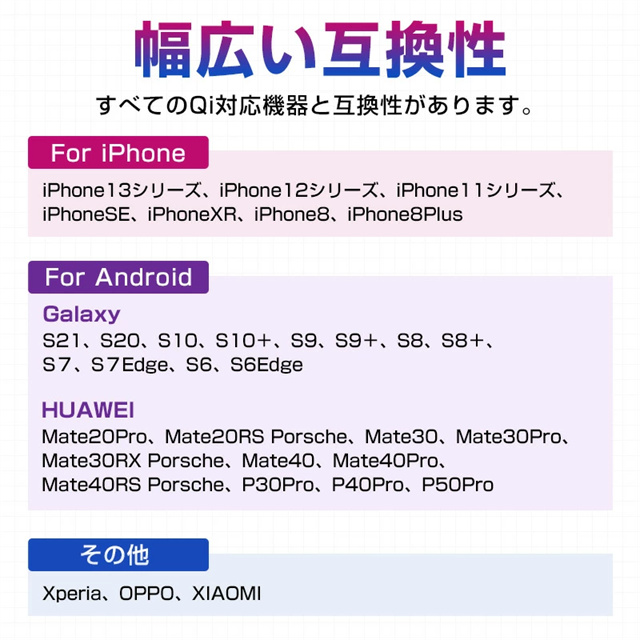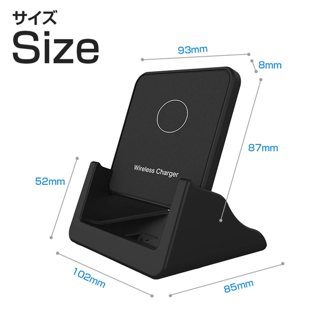 | 仕様 | ◆カラー:ブラック、ホワイト ◆本体サイズ:8*87*93mm ◆スタンドサイズ:52*102*85mm ◆ケーブル長さ:約110cm ◆重量(スタンド含め):120g ◆入力:5V-2A、9V-1.67A ◆出力:15W/10W/7.5W/5W ◆USB出力電流:1A ◆充電距離:0〜8mm ◆充電効率:80% ◆作業周波数:110〜205KHZ ◆材質:ABS+電子部品 ◆入力インターフェース:Type-c ◆商品内容:ワイヤレス充電器×1、スタンド×1、Type-Cケーブル×1 |