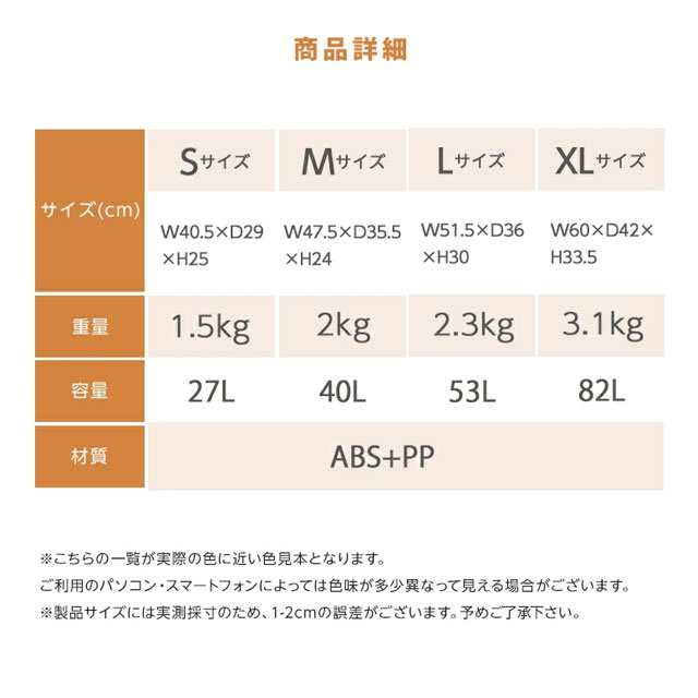 | サイズ | ◆【Sサイズ(27L)】約24cm×約40.5cm×約29cm ◆【Mサイズ(40L)】約24cm×約47.5cm×約35.5cm ◆【Lサイズ(53L)】約30cm×約51.5cm×約36cm ◆【XLサイズ(82L)】約33.5cm×約60cm×約42cm |