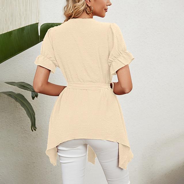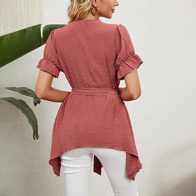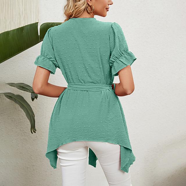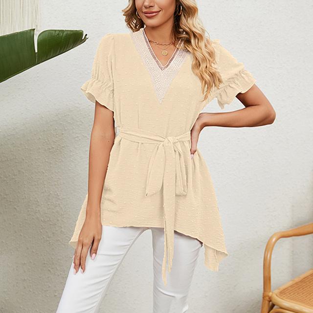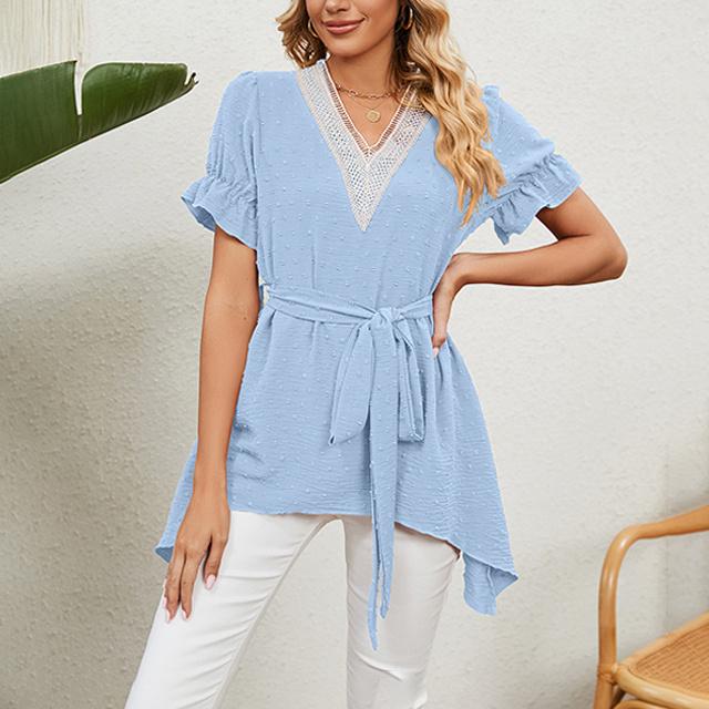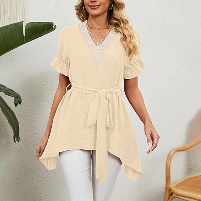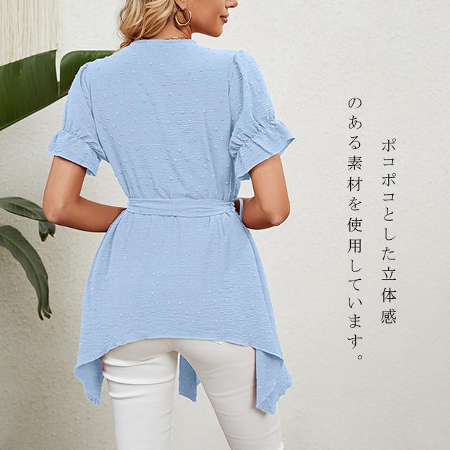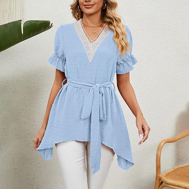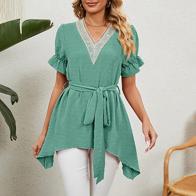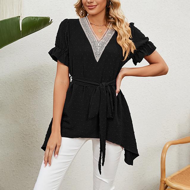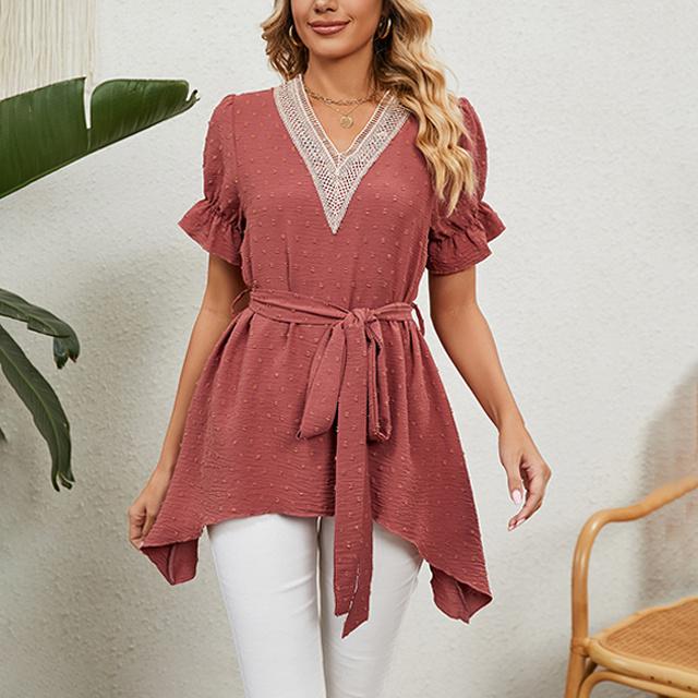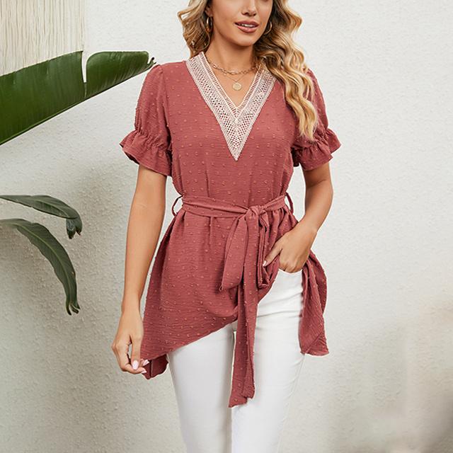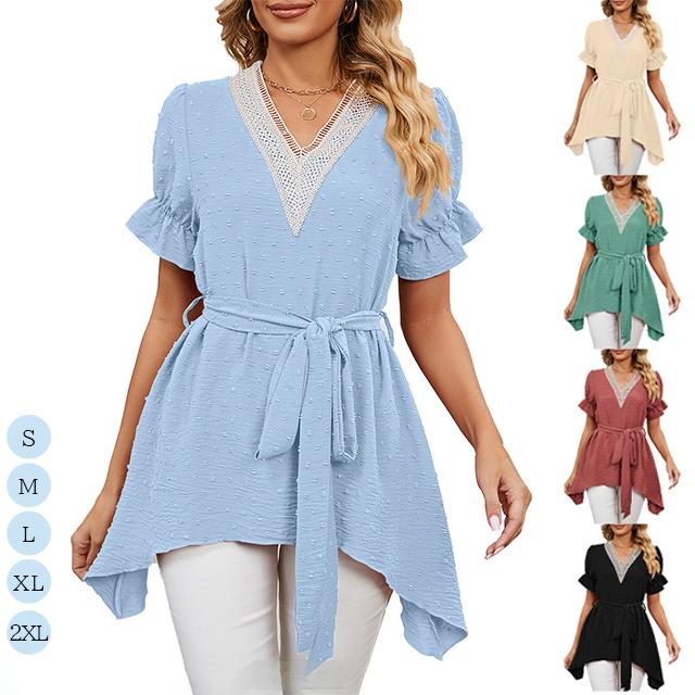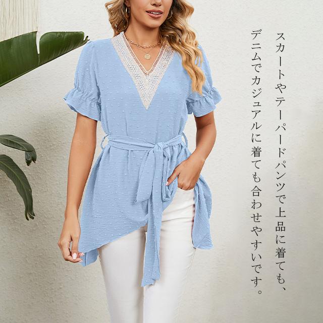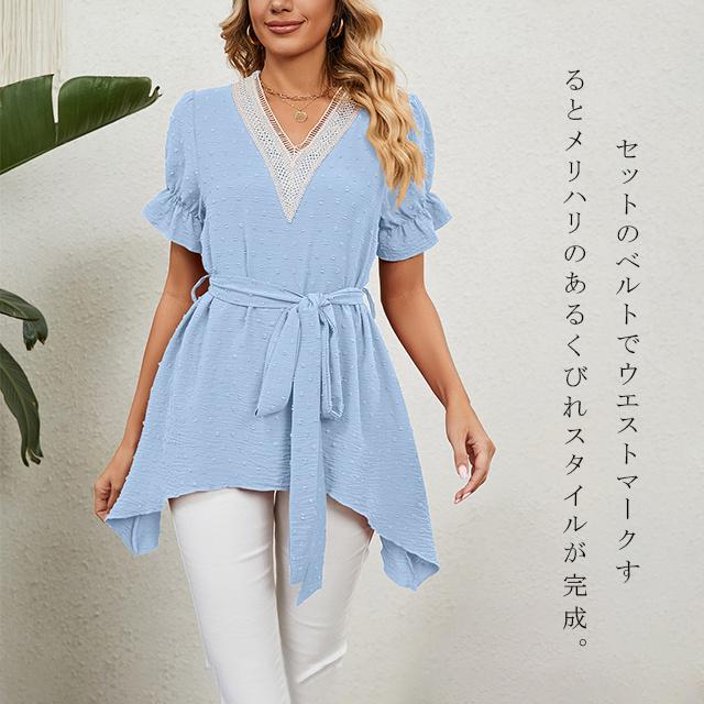 冬新作 送料無料 新作 ブラウス レディース 春夏 ふんわり切り替え Aラインブラウス 体型カバー レース ウエストマーク リボン フレア vネック ママ チュニック