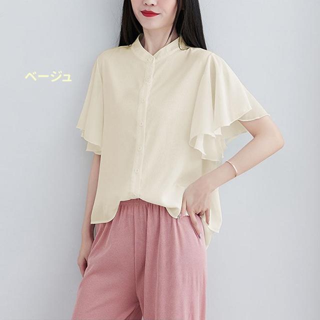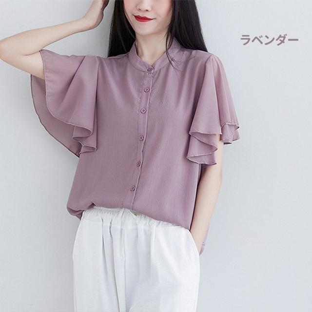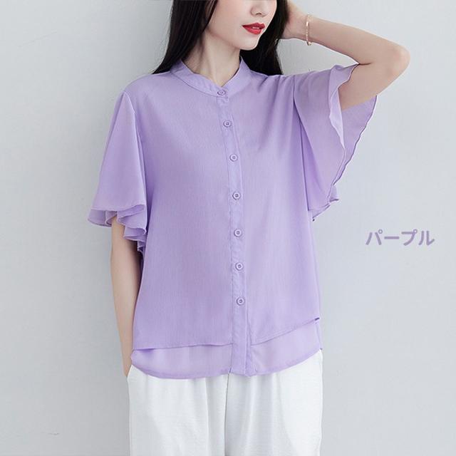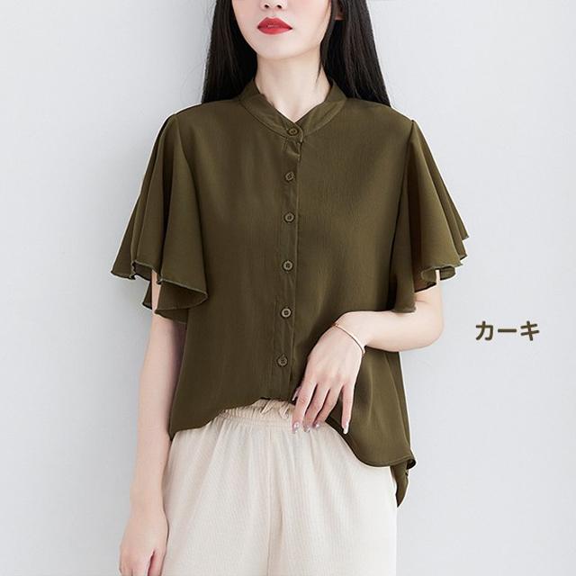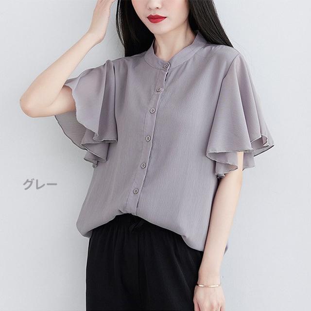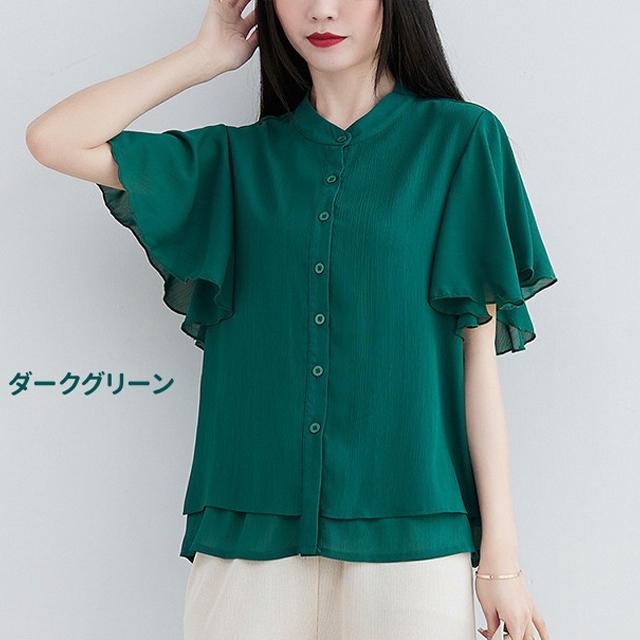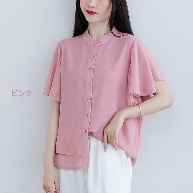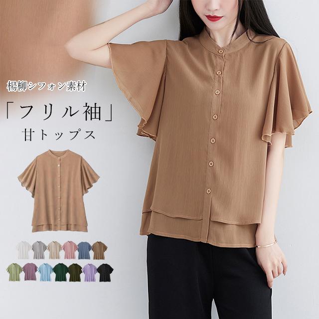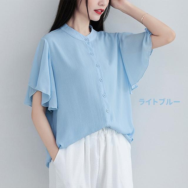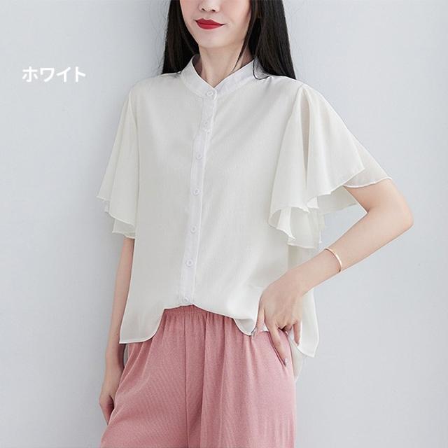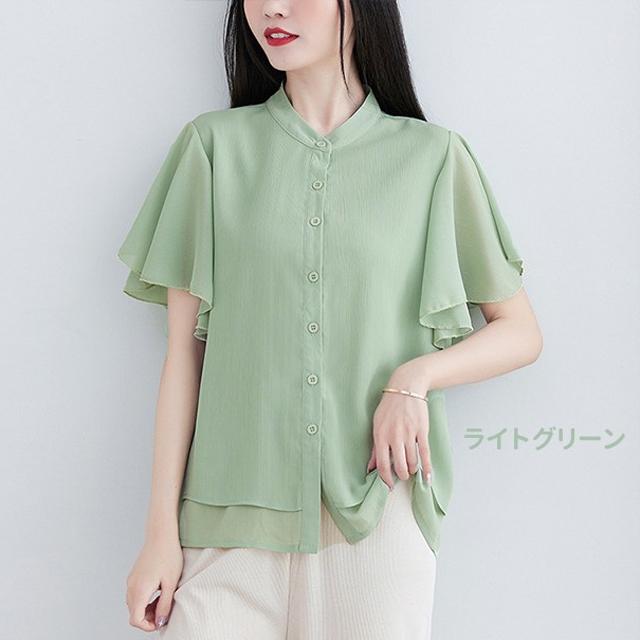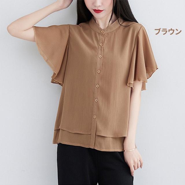 送料無料 冬新作 レディース 楊柳シフォン バンドカラー ブラウス フリル 半袖ブラウス レイヤード シフォン 透け感 夏 春 黒 白 半袖 カットソー おしゃれ 通勤 通学 結婚式 きれいめ エレガント 韓国