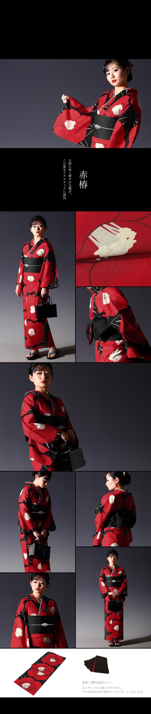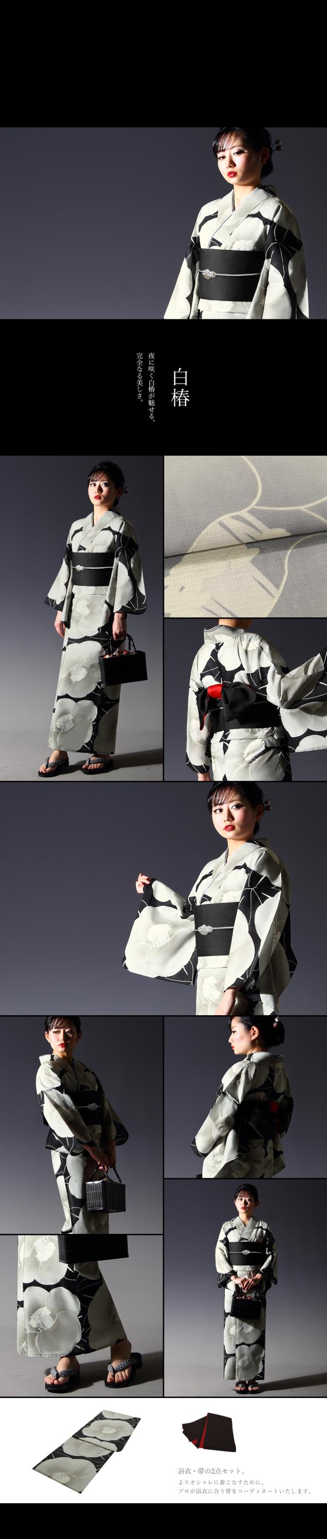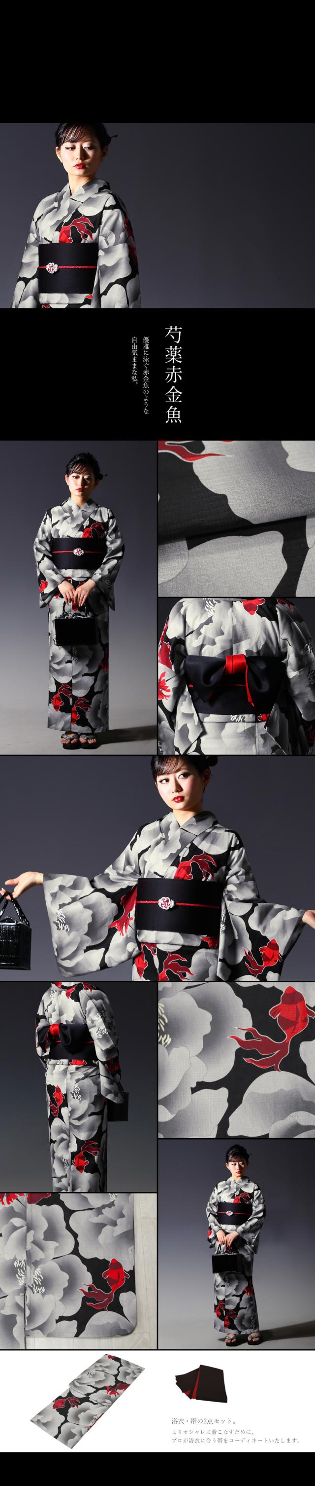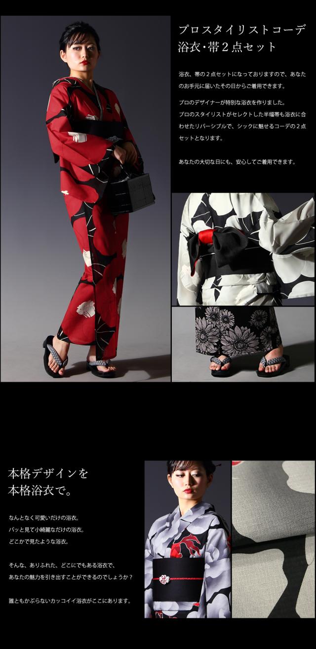 黒(ブラック)、赤(レッド)、白(ホワイト)・生成りを基調としたシックでかっこいい浴衣、帯の2点セット。
