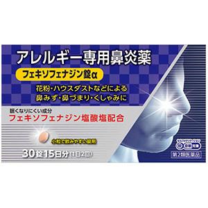 フェキソフェナジン錠αは、1回1錠、1日2回服用でフェキソフェナジン塩酸塩が花粉やハウスダストなどによるアレルギー症状を緩和します。また、口の中が渇きにくく、眠くなりにくいアレルギー専用鼻炎薬です。