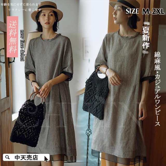 千鳥格柄ワンピース レディース 40代50代 綿麻ワンピース Aラインワンピース 夏 ゆったり 大人 気質 半袖ワンピース 丸首 カジュアル ママ服 韓国風 お出かけ