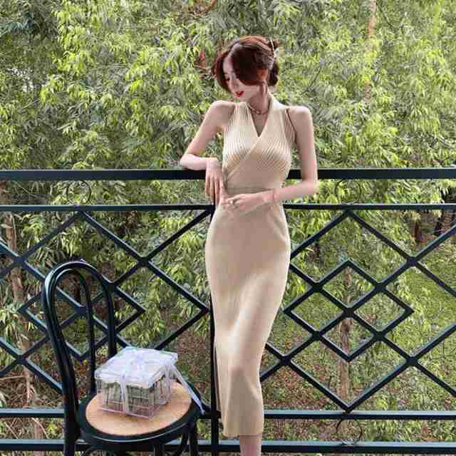 ニットワンピース 全3色 タイトワンピース ホルターネック バックオープン 無地 黒 ニット タイト ワンピース リブニット ロング きれいめ スリム 細見え デイリ