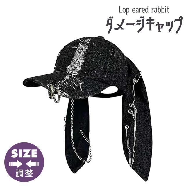 帽子 ロップイヤー デニムキャップ ダメージデニム キャップ ウサギ ウサ耳 レディース ピアス リング チェーン 安全ピン フリーサイズ 調整可能 男女兼用 メンズ ユニセックス ダメージ ダメージ加工 小顔効果 撮影用 文化祭 イベント