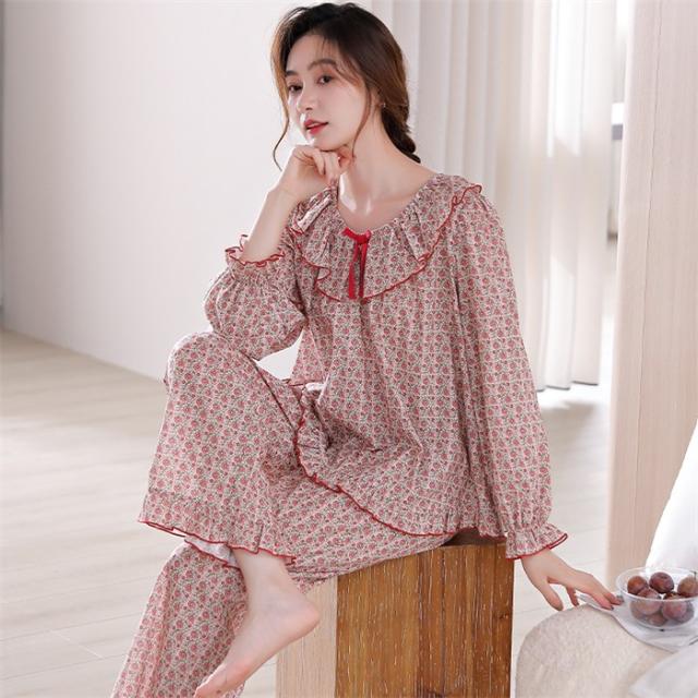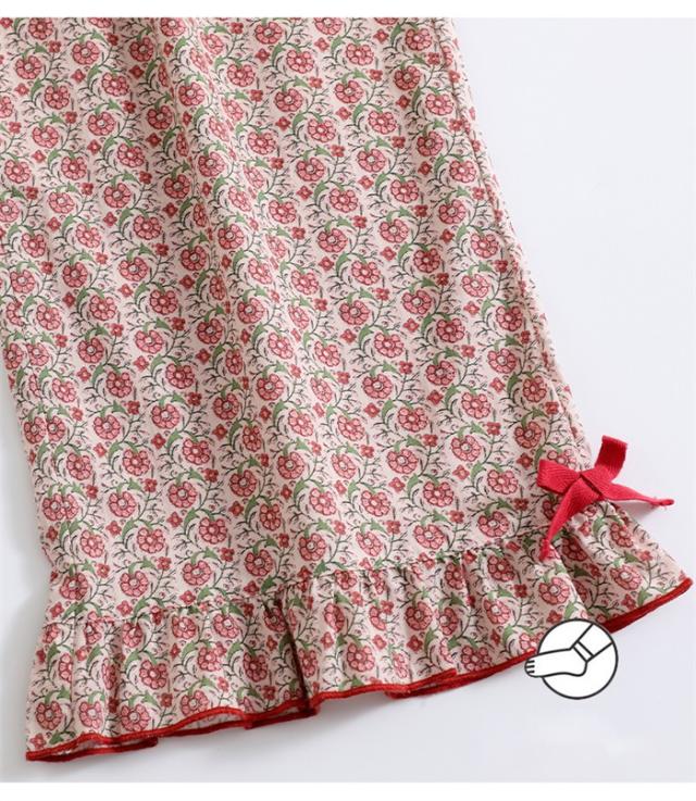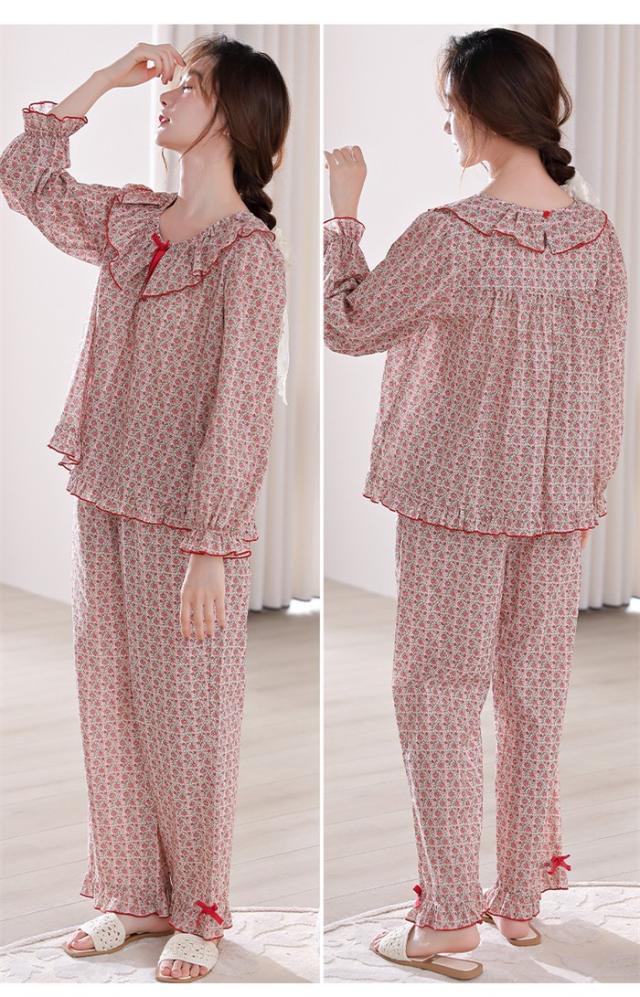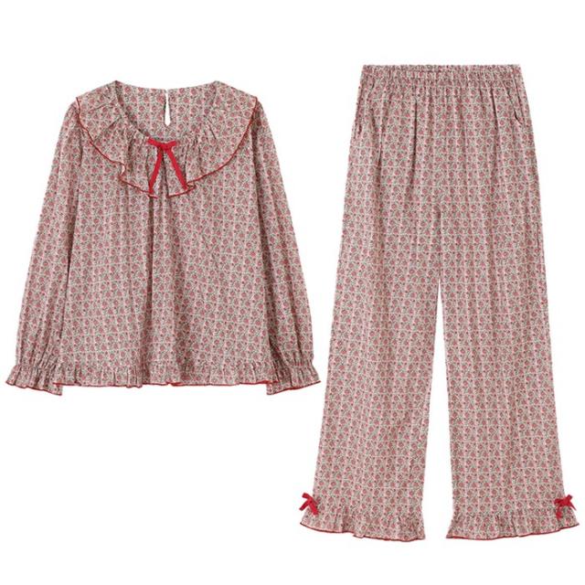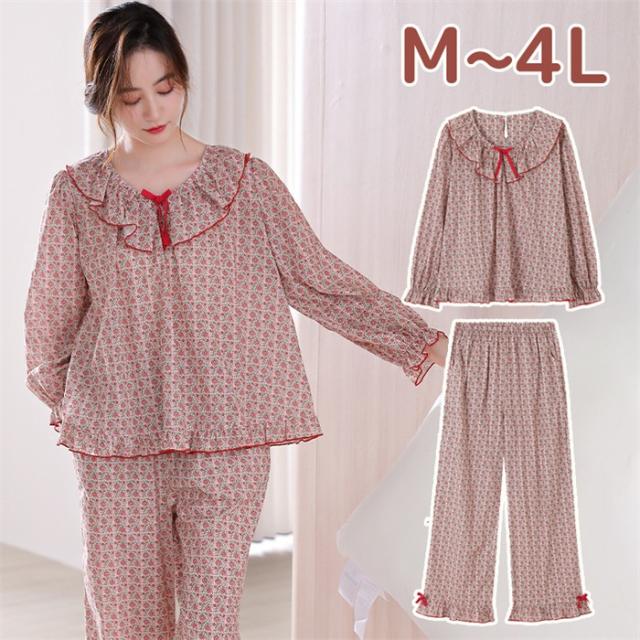パジャマ レディース 春 秋 花柄 小花柄 ルームウェア 長袖 上下セット レッド 赤 部屋着 寝間着 かわいい ウエストゴム ゆったり リラックス 女性 おしゃれ リボン フリル 誕生日 ギフト 結婚祝い 母の日 プレゼント 入院