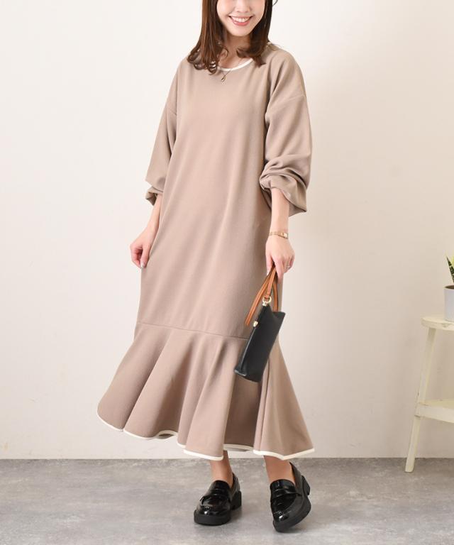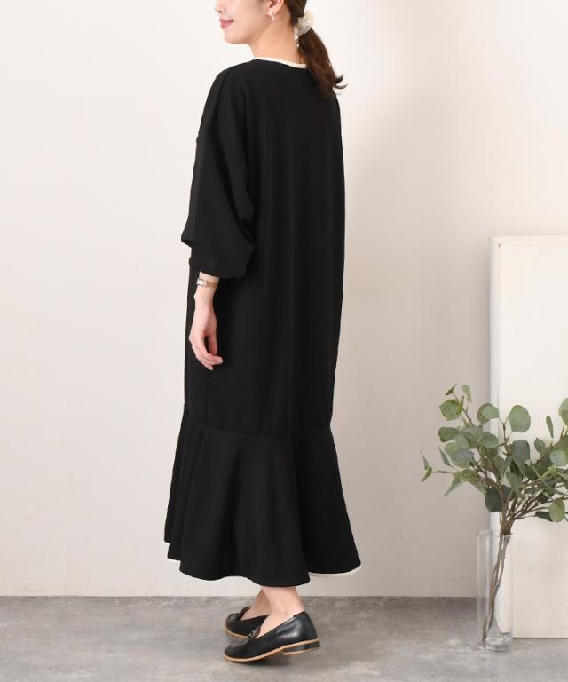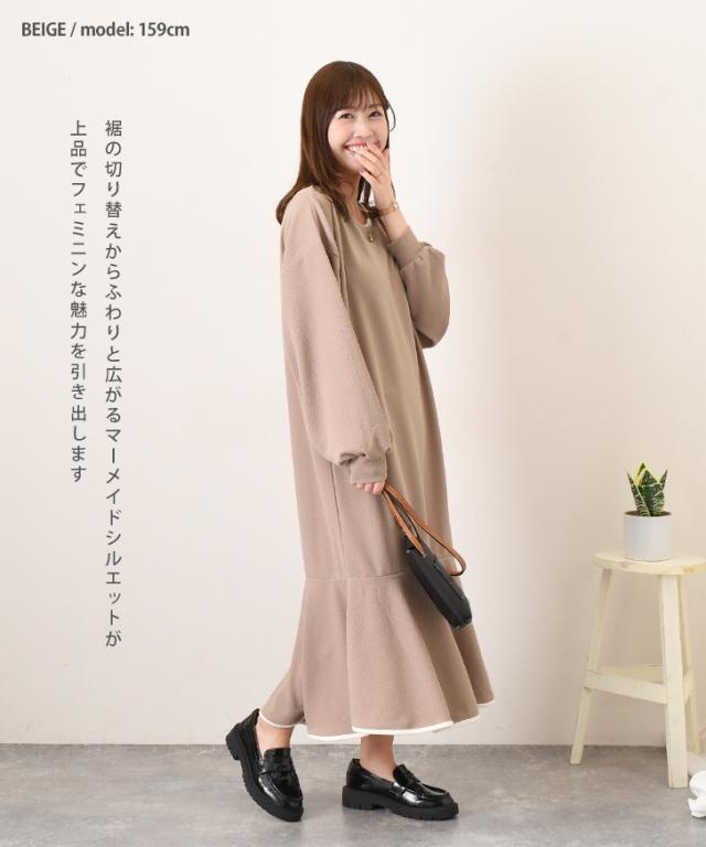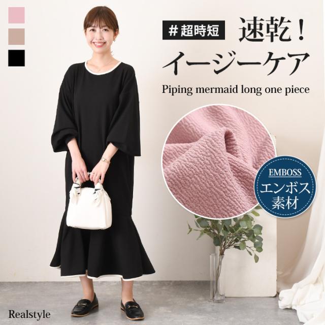 エンボスパイピングマーメイドロングワンピース レディース 長袖 きれいめ 春 速乾 すぐ乾く 時短 ゆったり 体型カバー おしゃれ 可愛い オフィス 通勤 通学 楽ちん 無地 イージケア シワになりにくい 大人 マキシ丈 マーメイドワンピース Aライン ラウンドネック ストレッチ OL 快適 フェミニン 大人可愛い リラックス 韓国ファッション 着痩せ ロング丈 マキシワンピース クルーネック 丸首 フリル オフィスカジュアル 仕事 職場 会社 ルームウェア 部屋着 おうち時間 お出かけ 20代 30代 40代 50代 主婦 母 ママ ガーリー ラフ 大人カジュアル 清楚 キレイめ かわいい カワイイ オシャレ お洒落 黒 ブラック ネイビー ベージュ 紺色 デイリー デート フォーマル 入学式 卒業式 入園式 卒園式 女子会 お呼ばれ 会食 食事会 ワンマイル ワンマイルウェア 街着 軽やか 軽い 秋 冬 秋冬 ロングシーズン 洗える 洗濯 ウォッシャブル 伸縮 伸びる 凹凸 ぽこぽこ マタニティ 妊婦 ぽっちゃり 細見え 脚長 超時短 梅雨 雨の日 お手入れ簡単 高身長 ラインカバー 体系カバー 配色 バイカラー 裾フリル バルーン袖 バルーンスリーブ ボリューム袖 ボリュームスリーブ