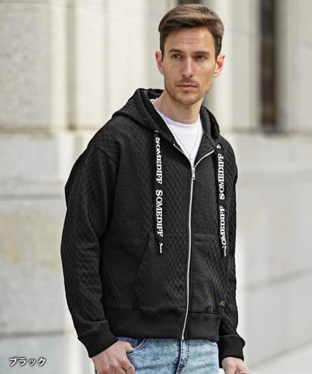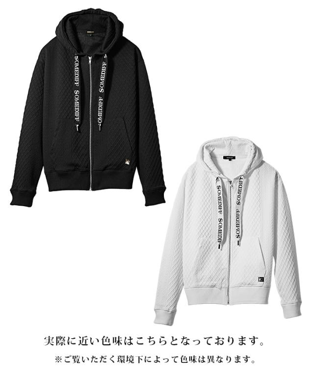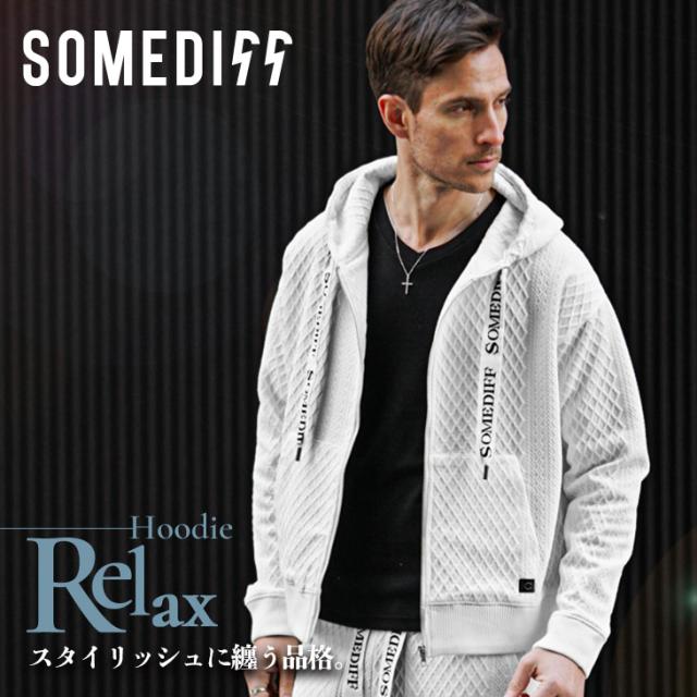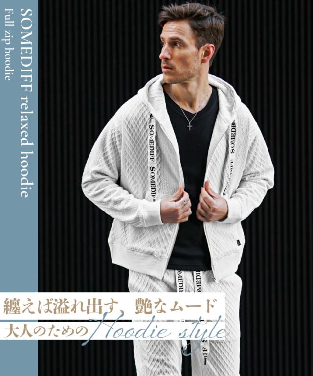 SOMEDIFF (サムディフ) 『リラックスフルジップパーカー』【リラックスフルジップパーカー】■Design/デザインストレスフリーな着こなしを楽しめるイージーなフルジップパーカー。セットアップのドローコードにはブランドロゴをさりげなくデザイン。オトナのリラックスをイメージして出来上がったフルジップパーカーなので、春夏に活躍しオトナの余裕を感じさせる異なる凹凸のパターンを生地の切り替えとして挟むことでシンプルながら目を惹くデザインに。軽量でありながらもストレッチ性に優れ、洒脱な着こなしに仕上げてくれる。■Material/素材感ポリエステルとポリウレタンを混合した、なめらかな肌ざわりが特徴。伸縮素材を採用しており、窮屈感のない快適な着心地を楽しめる。